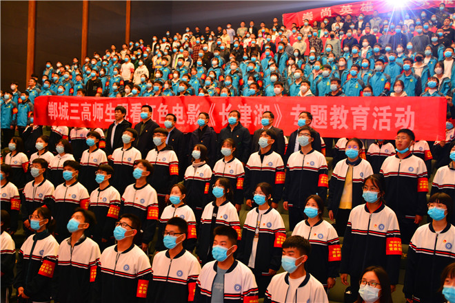 浩浩荡荡的师生队伍穿越县城大街小巷,队伍整齐,纪律严明,经历一个小时的“行军”,引得许多路人驻足观看,拿出手机录像,为三高师生点赞。下午两点,郸城新视界奥斯卡国际影城巨幕厅。400多名师生高唱国歌,刘远升勉励大家要从抗美援朝战争中汲取精神力量,继承先烈的大无畏精神和革命乐观主义精神,自励自强,爱家报国,影片中,我军战士御寒只有破旧的棉衣,武器多靠缴获,而美军则装备精良,拥有各式先进飞机、坦克。美军过节时吃的大鱼大肉,与我军一天只有一个冻的冷硬的土豆形成鲜明的对比。很多学师生都是含泪吃下土豆,并不是因为难吃,而是深受影片的震撼,很难想象英雄们付出了多少努力才换来现在的和平与安定。