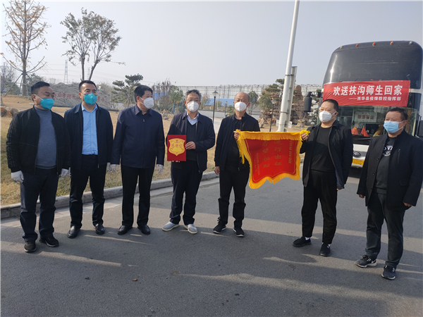临行前,西华县政协主席郭峰、副县长王超及该县卫健委党组书记赵冬等人先后来到集中隔离点和安罗高速西华出入口为师生们送行,并收到了来自扶沟县送来的写有“逆行出征, 守望相助”的锦旗和一封感谢信。