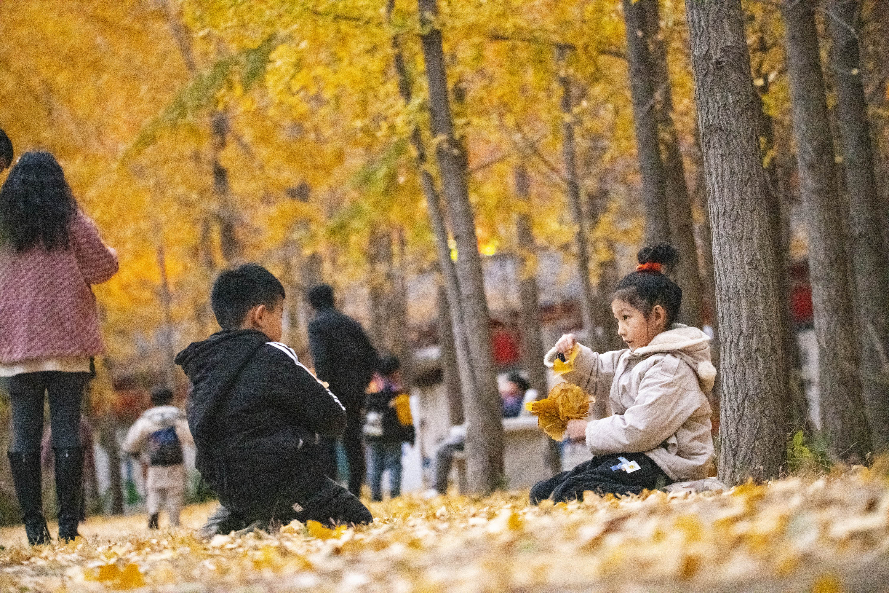 孩子们在银杏树下捡树叶