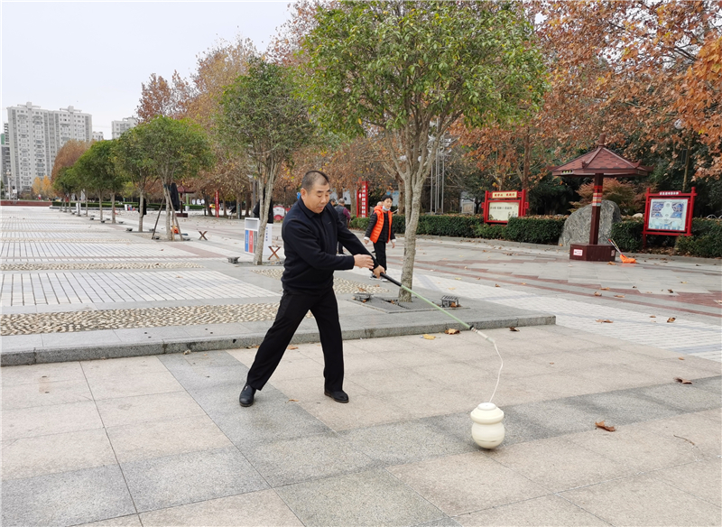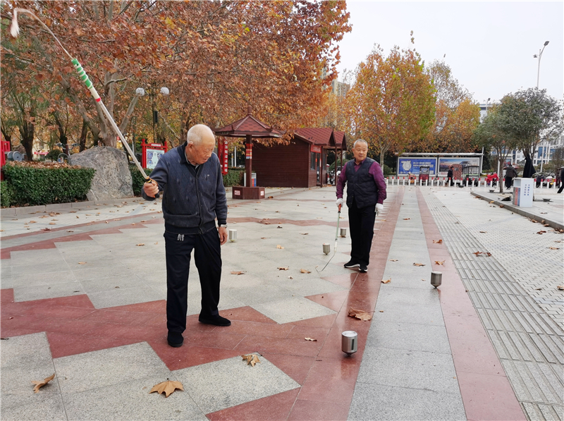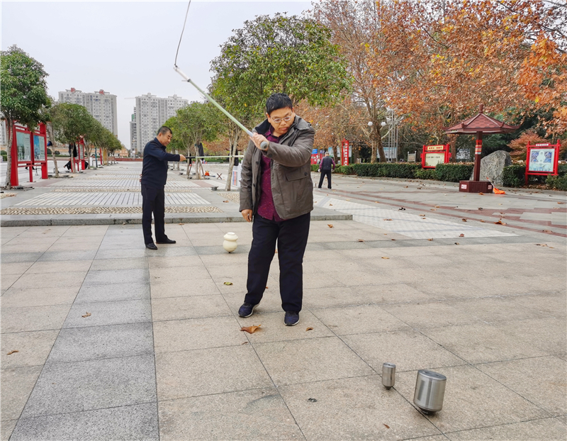 11月23日下午,周口经济开发区人民广场上,不少市民在玩陀螺。如今,随着城市生活水平不断提高,广大市民的健身方式逐渐多样化,打陀螺这项儿时的游戏悄然兴起,成为老少皆宜的健身新宠。