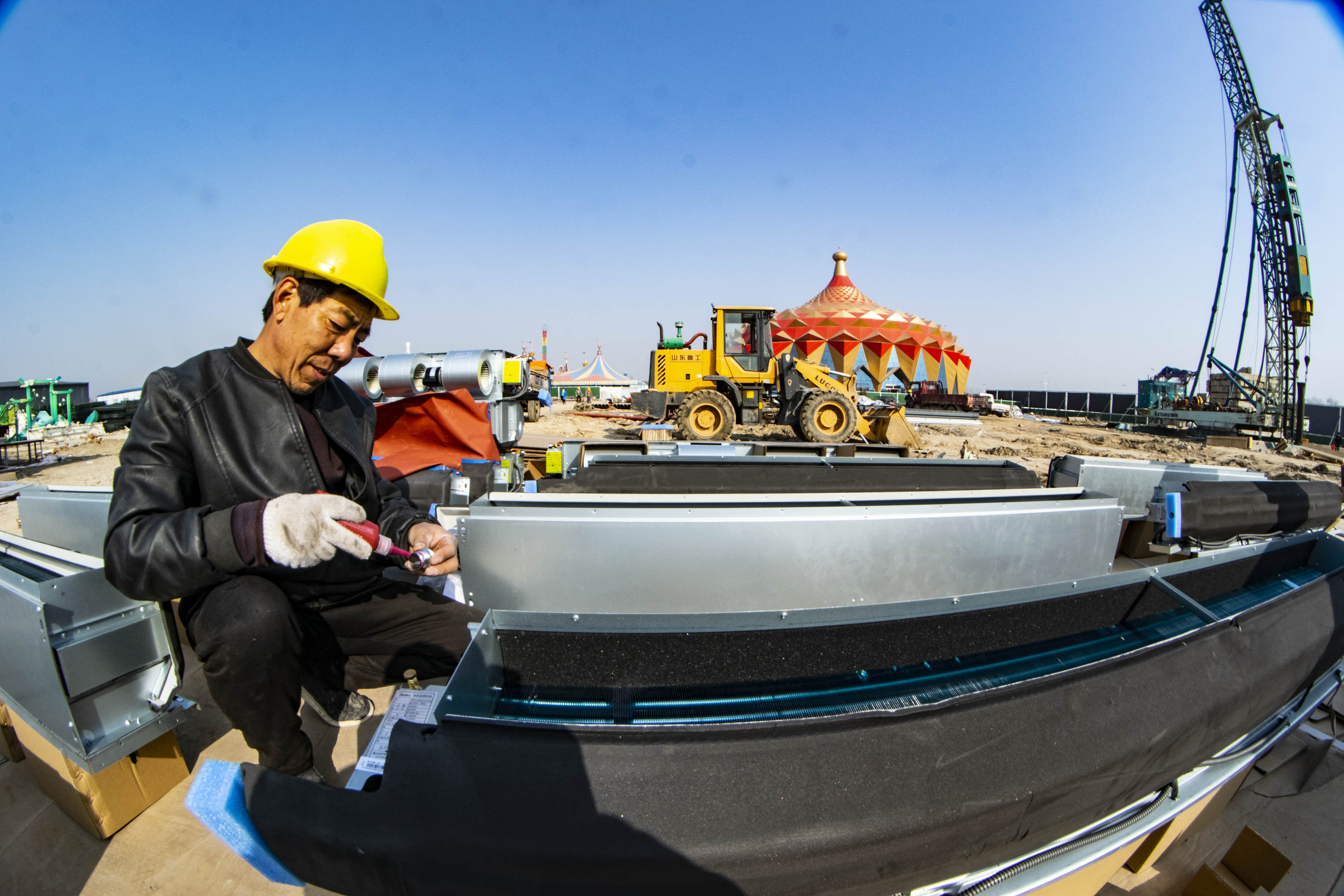 工人们正在室外组装中央空调