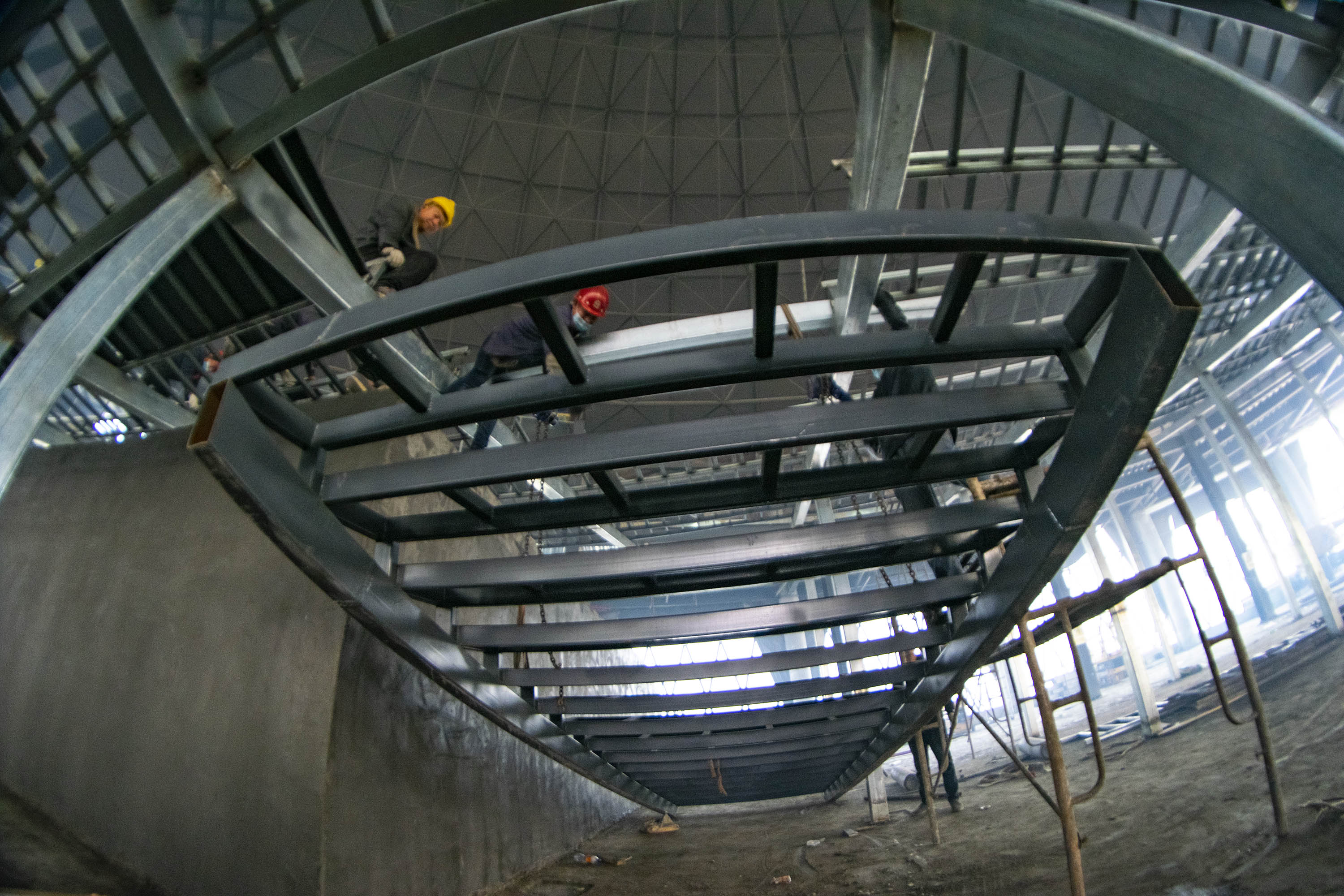 工人们吊装看台楼梯