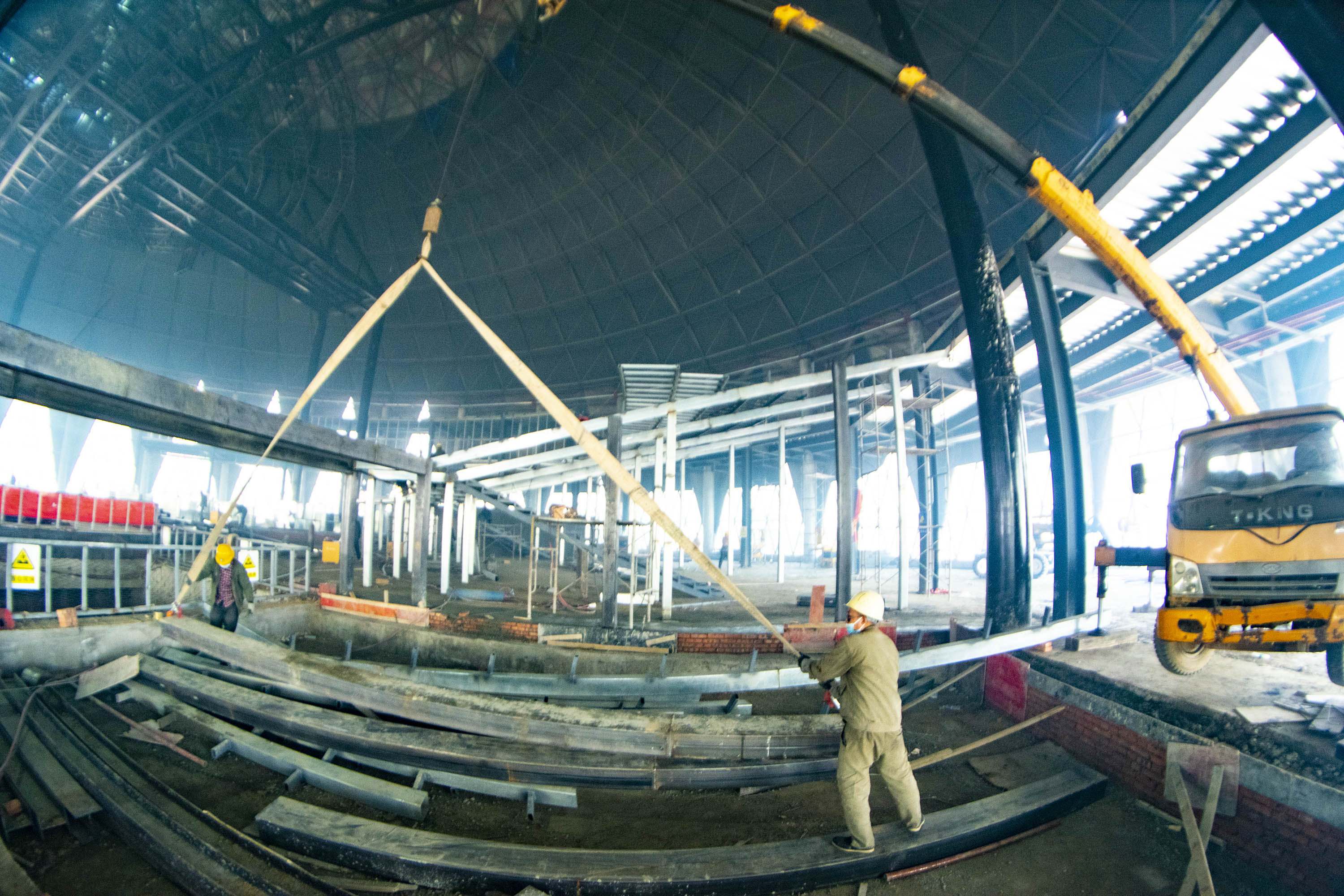 工人们吊装看台钢架