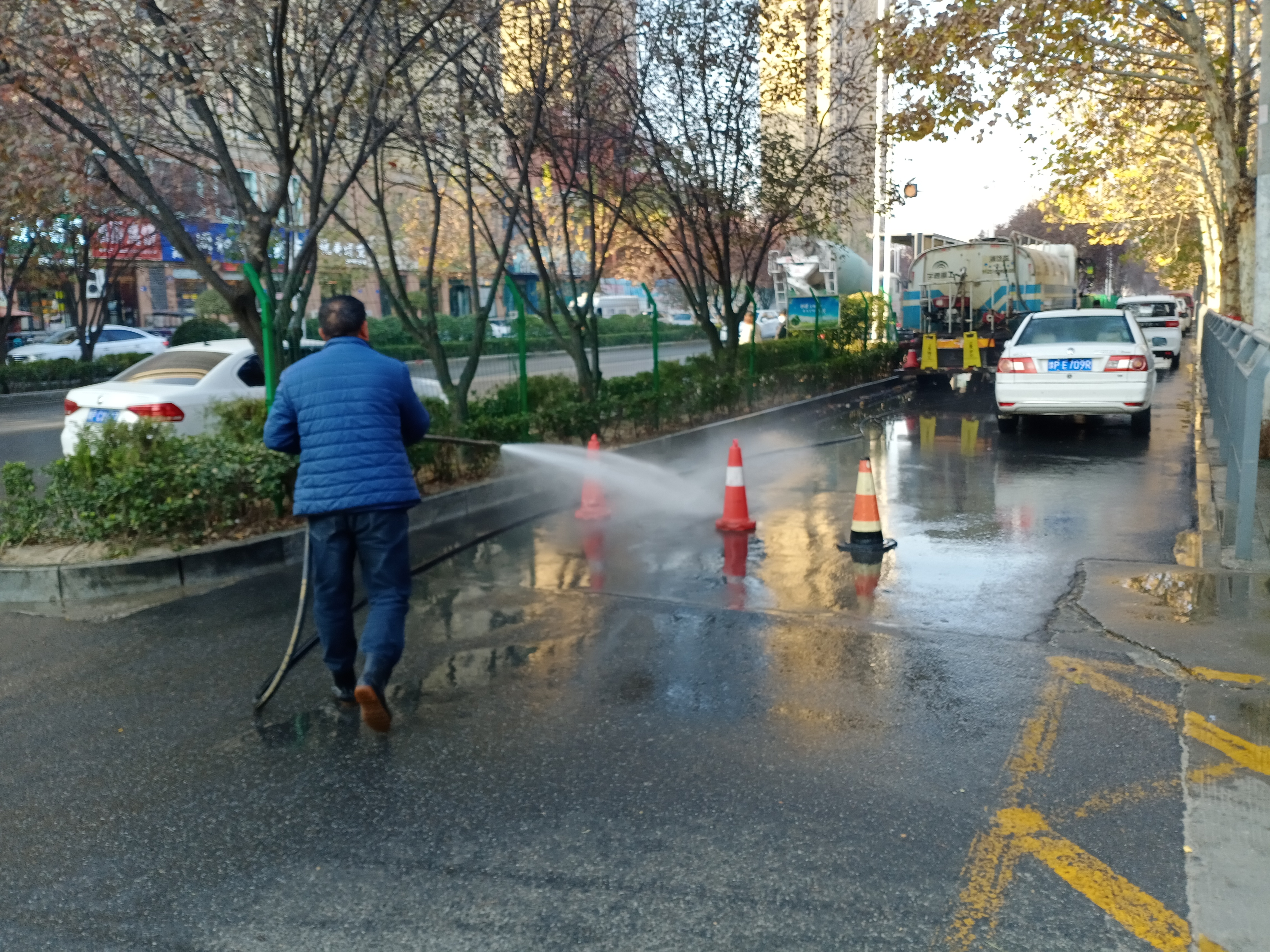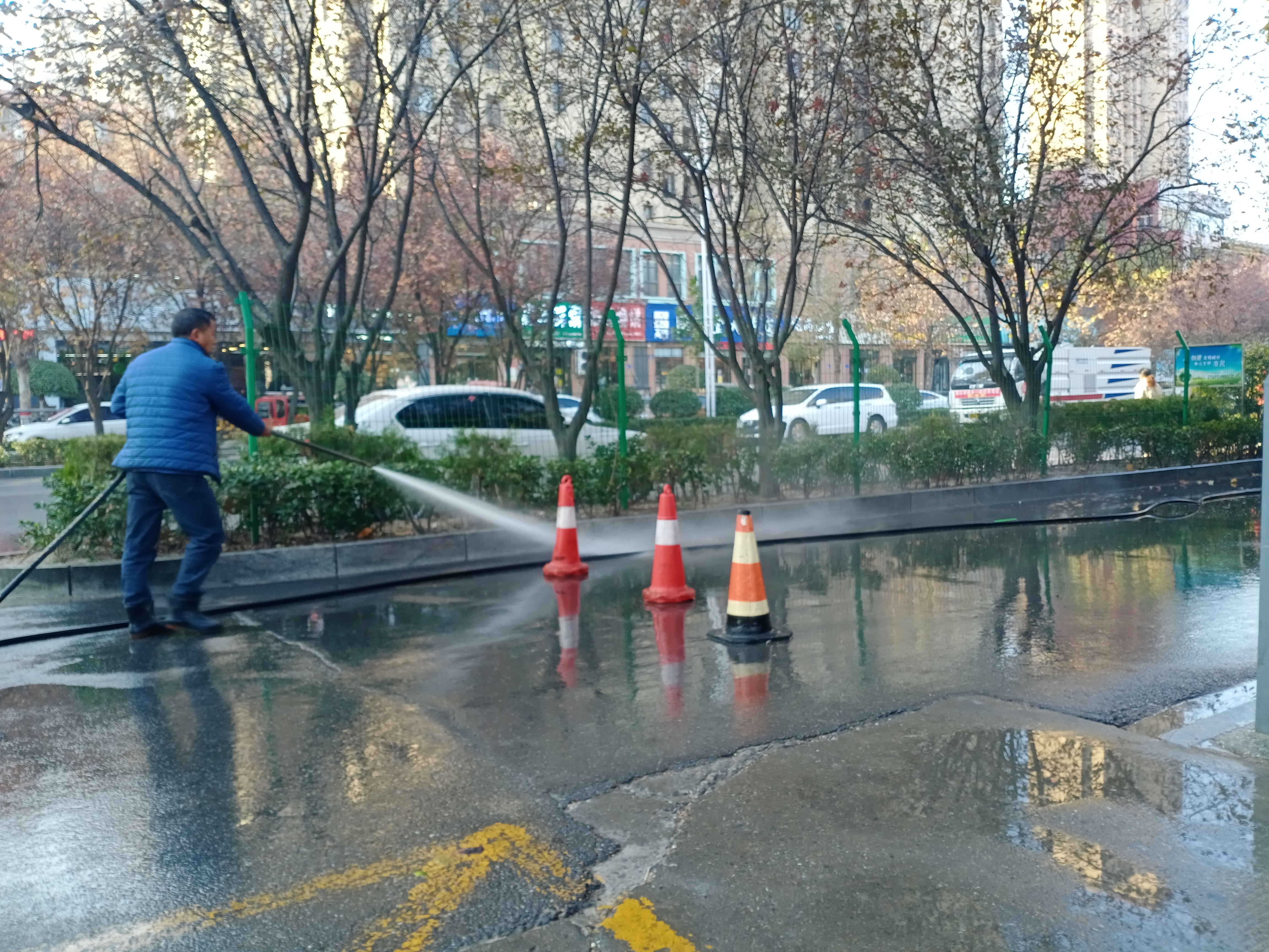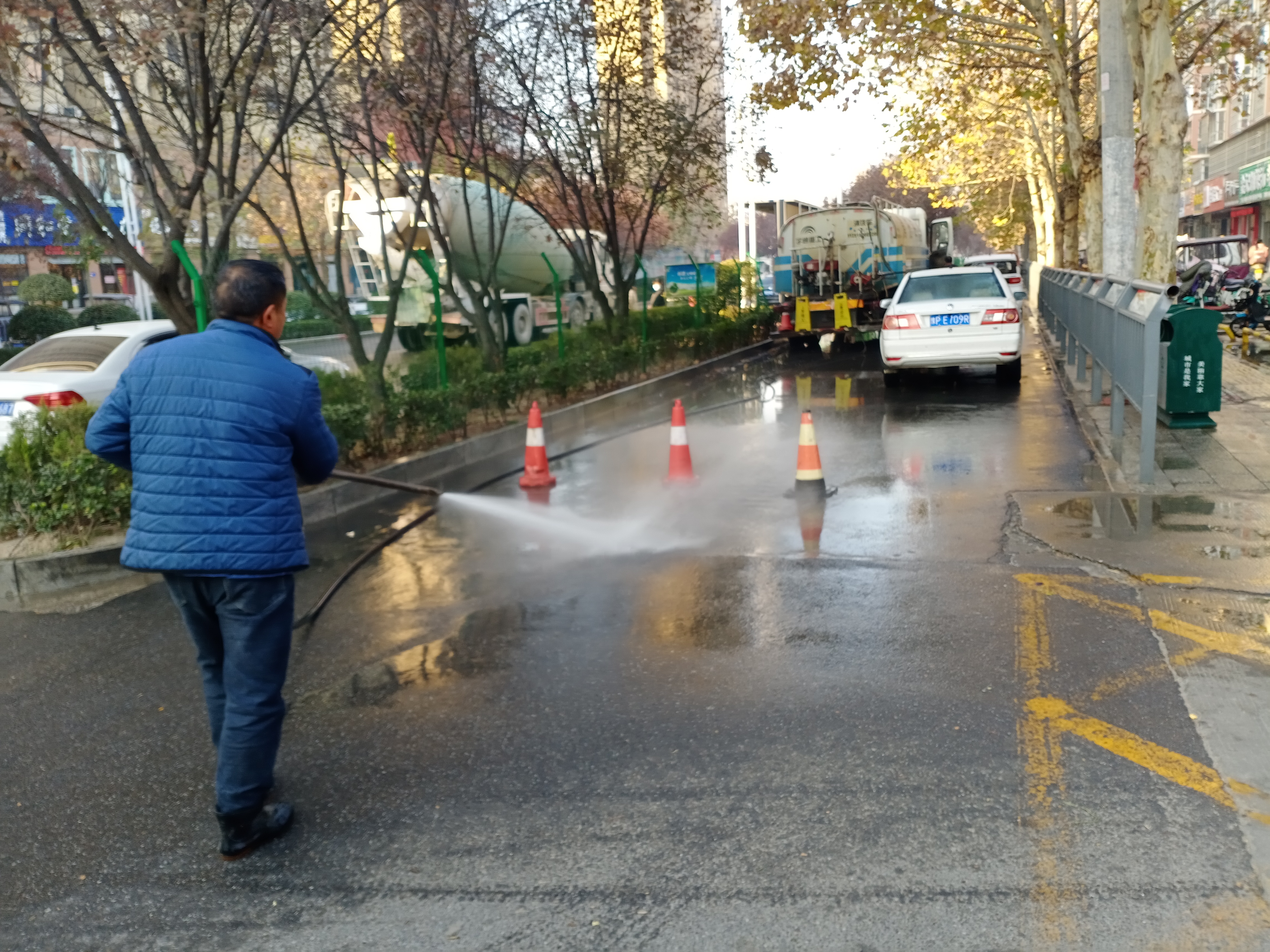 12月6日,记者在周口市中心城区庆丰路上看到,工作人员正在用水枪冲洗慢车道,为市民出行创造更加干净整洁的环境,也为“创文”贡献一份力量。②13