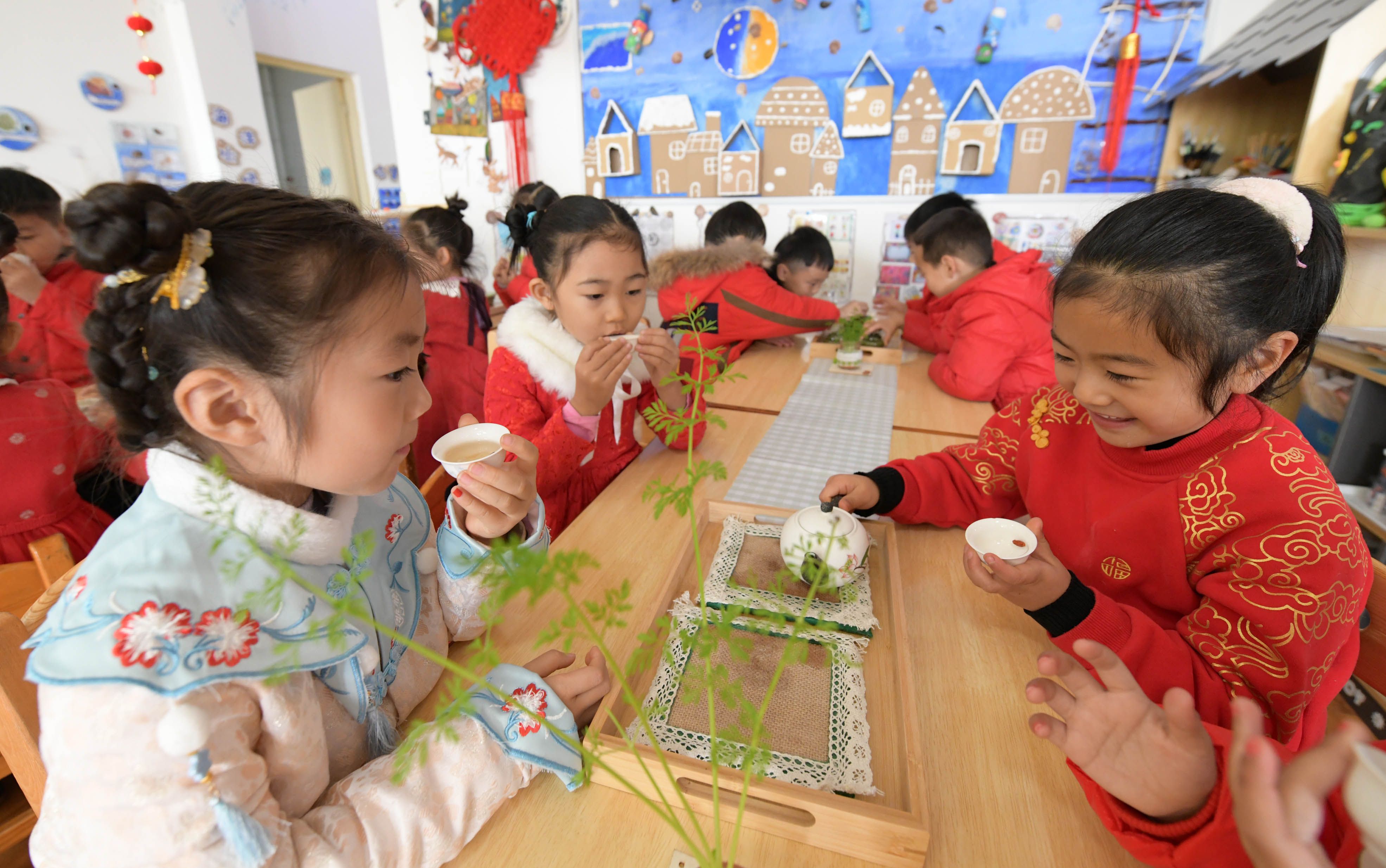 小朋友们学习传统茶艺,喝冬至暖茶。