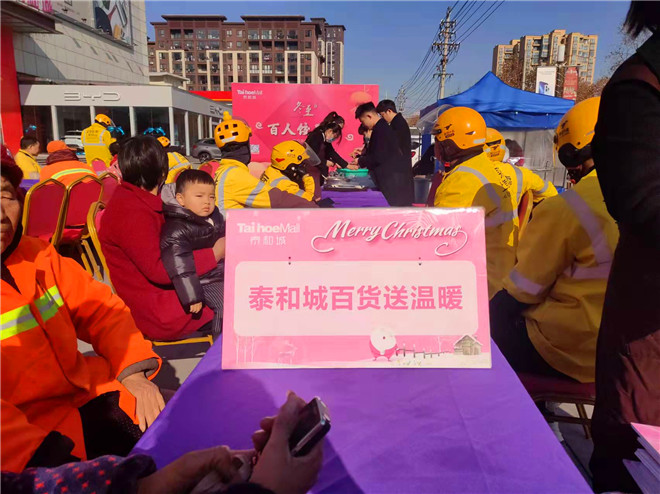 人间小团圆,冬至大如年。12月21日,是二十四节气中的冬至,为传承和弘扬民族文化,丰富传统节日文化生活, 感谢劳动者的辛勤付出,当天上午,泰和城百货在泰和城广场举办“冬至 百人饺子宴”活动,为外卖小哥、孤寡老人以及“城市美容师”环卫工等百余人送上一份温暖。