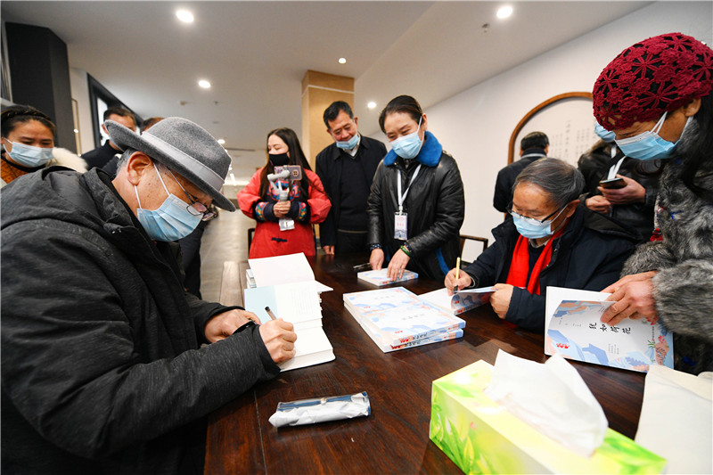 返乡参加开馆仪式的著名作家刘庆邦、墨白为读者签字赠书