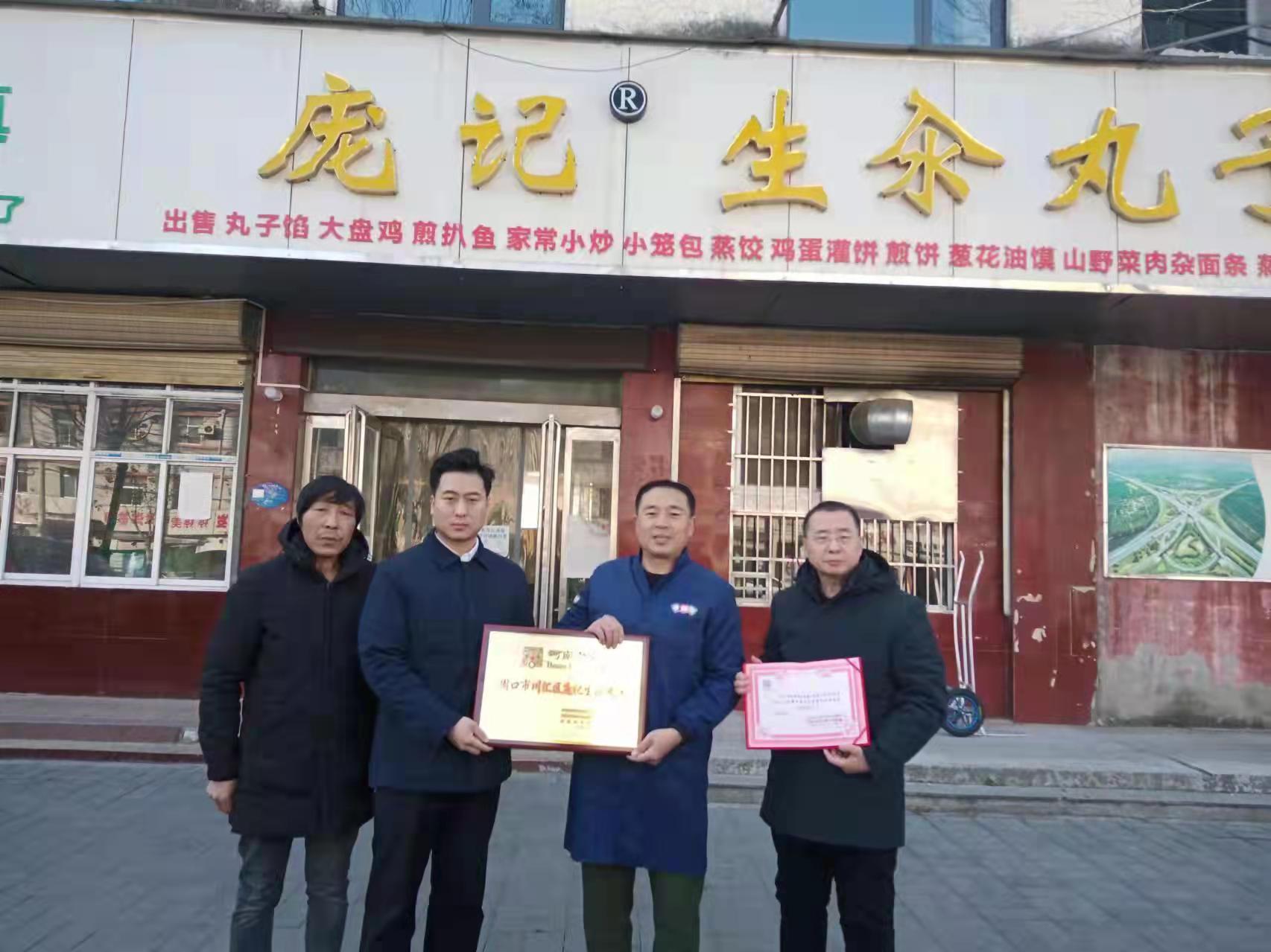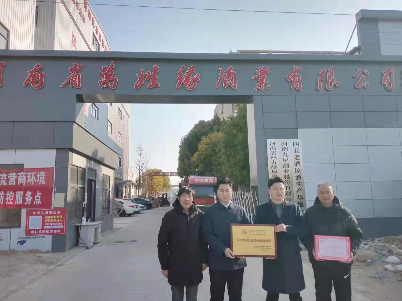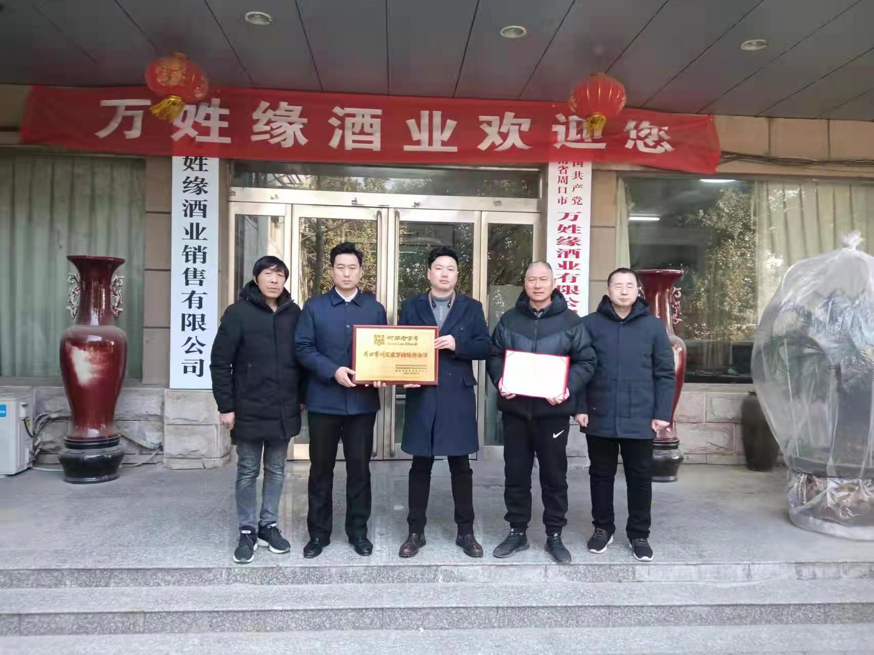 12月28日,川汇区民协主席杜超给获得“河南老字号”称号的庞记生汆丸子、万姓缘酒业等单位,颁发牌匾及荣誉证书。