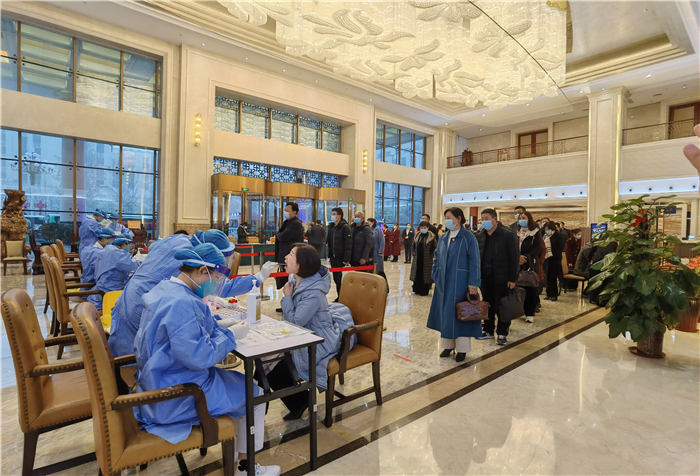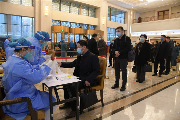 在周口代表团驻地紫荆山宾馆,大会组委会要求与会人大代表在出发地和入住地,分别进行核酸检测,入住地两次检测结果均呈阴性后方可参加会议。记者王映摄②3