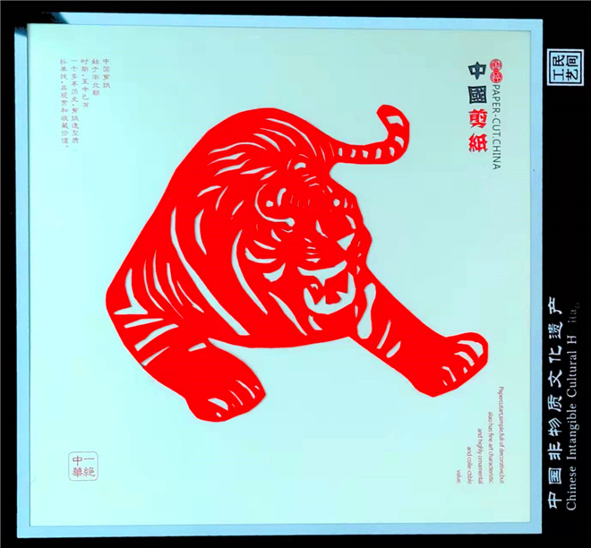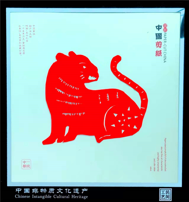为了庆祝虎年,王春梅创作的秸秆画主要有《威震九霄》《虎之王者》《飞天神虎》等,此外,她还创作了两幅剪纸作品,分别是《虎年组图》和《虎之2022》。和剪纸作品相比,秸秆画制作工序更加复杂,全凭手工完成,充分利用秸秆本身的纹理和质地,结合颜色、温度的变化,将画面立体的呈现出来。其中,她创作的部分作品结合了唐卡的相关风格和颜色配比,比如《威震九霄》中虎的形象所表现出来的力量感借鉴了唐卡中护法的力量感;《虎之王者》和《虎之2022》中对于蓝色的运用结合了唐卡中的蓝色,代表了永恒不变,如同穹苍揽护万物之意。