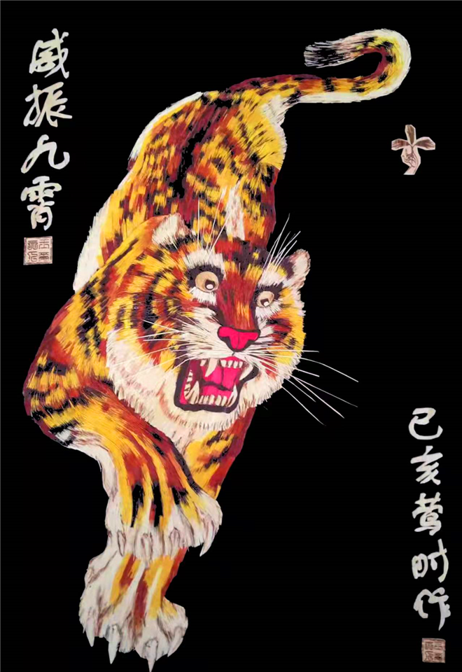 据王春梅介绍,画中老虎身上所有的虎毛全部是用秸秆先染色,然后把这些染好颜色的秸秆用剪刀剪成人头发丝一半粗细的虎毛形状,再用镊子一根一根地层层嵌上去,需要盘丝的毛发所花费的功夫更是成倍地增加。最终所呈现出来的老虎栩栩如生,极具观赏性。