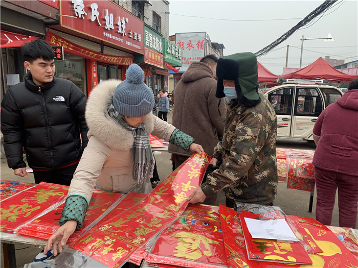 春节将至,不断映入眼帘的喜庆“福”字映衬着摩肩接踵的人群。赶集时,家家都要买几张年画、几副春联,今年,以“虎”为主题的年画春联自然成了主角。“这个虎头年画今天已经脱销了,这个‘年年有余’的也喜庆。”摊主王大姐一边帮顾客挑年画一边笑着说。年前,她早早囤好了近百种样式的老虎年画,现在看来还是不够卖。除了过年必备的年画春联,她还准备了红灯笼、红烛等,也十分畅销。