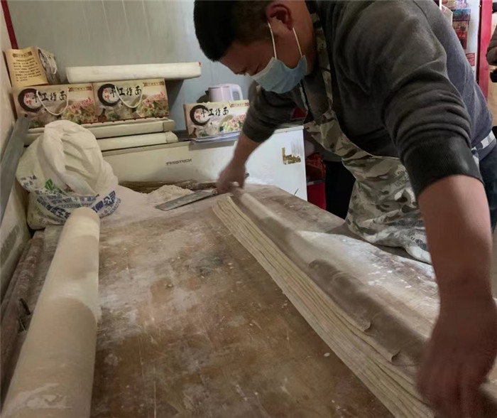 此时,固墙镇集市最低温度为零摄氏度,40岁的王永强却汗流浃背。他,正在自家面馆里忙得热火朝天。从14岁起,王永强就跟着表哥学习做手擀面,到现在已有26年的制作经验。“过年这段时间一天擀10小时以上,能出个七八百碗,就这都卖不及。”王永强边说边做准备工作,只见他将一盆醒好的、重40斤,用高筋面粉和盐和好的面团铺在案板上,拿出一根一米五长的铁棍将面团按压平整,再用有十几年历史的擀面杖,边铺撒玉米淀粉、边用力擀。1个小时后,面团被擀至薄皮状,最后按层折叠铺好,用快刀切成相等宽度,掸走多余面粉,挽成麻花状。如此,遇水不散、出水不沾、温润光滑、筋而不腻的固墙手擀面就完成了。固墙手擀面最常见的做法是用大火多水煮沸后,捞起配以番茄鸡蛋、蒜泥黄瓜,拌匀后享用。夹起一筷子面条,观其形如玉带临风,察其色若飞雪粼粼,送入口中品其味,则似玉兰入口,真是美哉!爽哉!