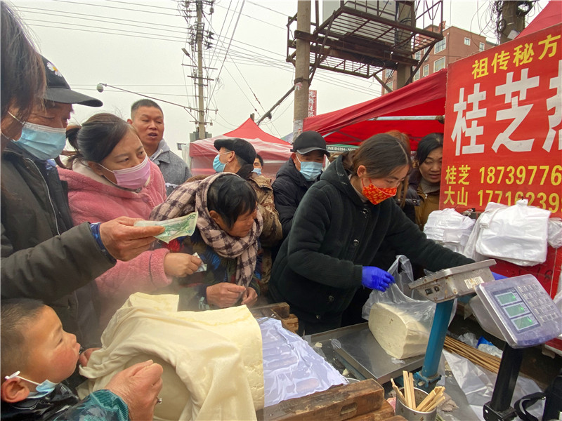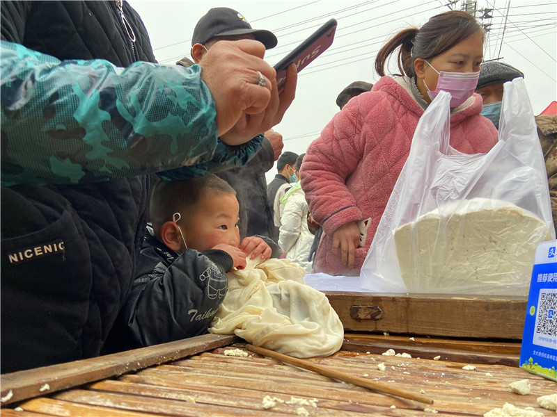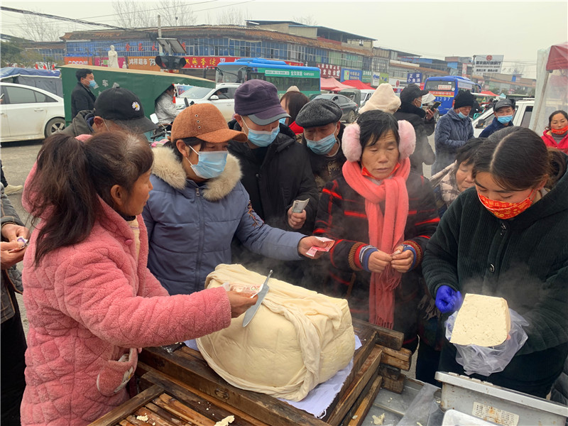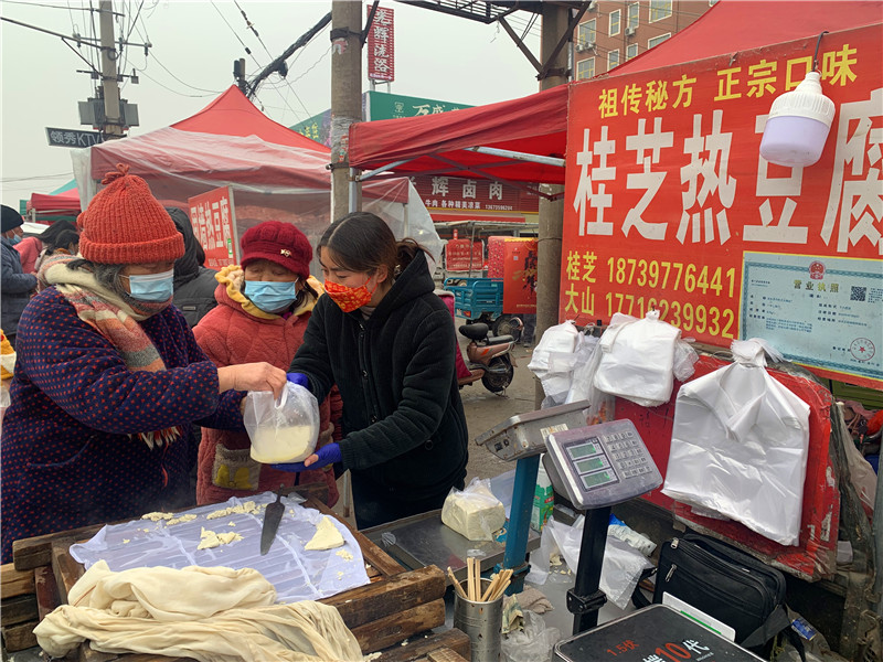 在固墙镇的集市上,“桂枝热豆腐”摊位前的顾客络绎不绝。“给我来50块钱的豆腐”“我要20斤,先给我切豆腐吧”“我要30斤,多少钱”……人群将豆腐摊里三层外三层围了起来,从人群外朝里看看不见豆腐,只看到豆腐摊里冒出来的团团热气。“等了半个小时了,刚才那一盒豆腐没轮到我就卖完了,这才抢到手。”附近的村民杨大爷拿着刚买的豆腐高兴地说。“我从鹿邑来的,姐姐在里面挤着买豆腐,我在这儿等她呢。”9岁的张家瑞说,她每年放寒假都会和家人一起到固墙来探亲,过年的时候逛逛集市,顺便买些豆腐带回鹿邑。
