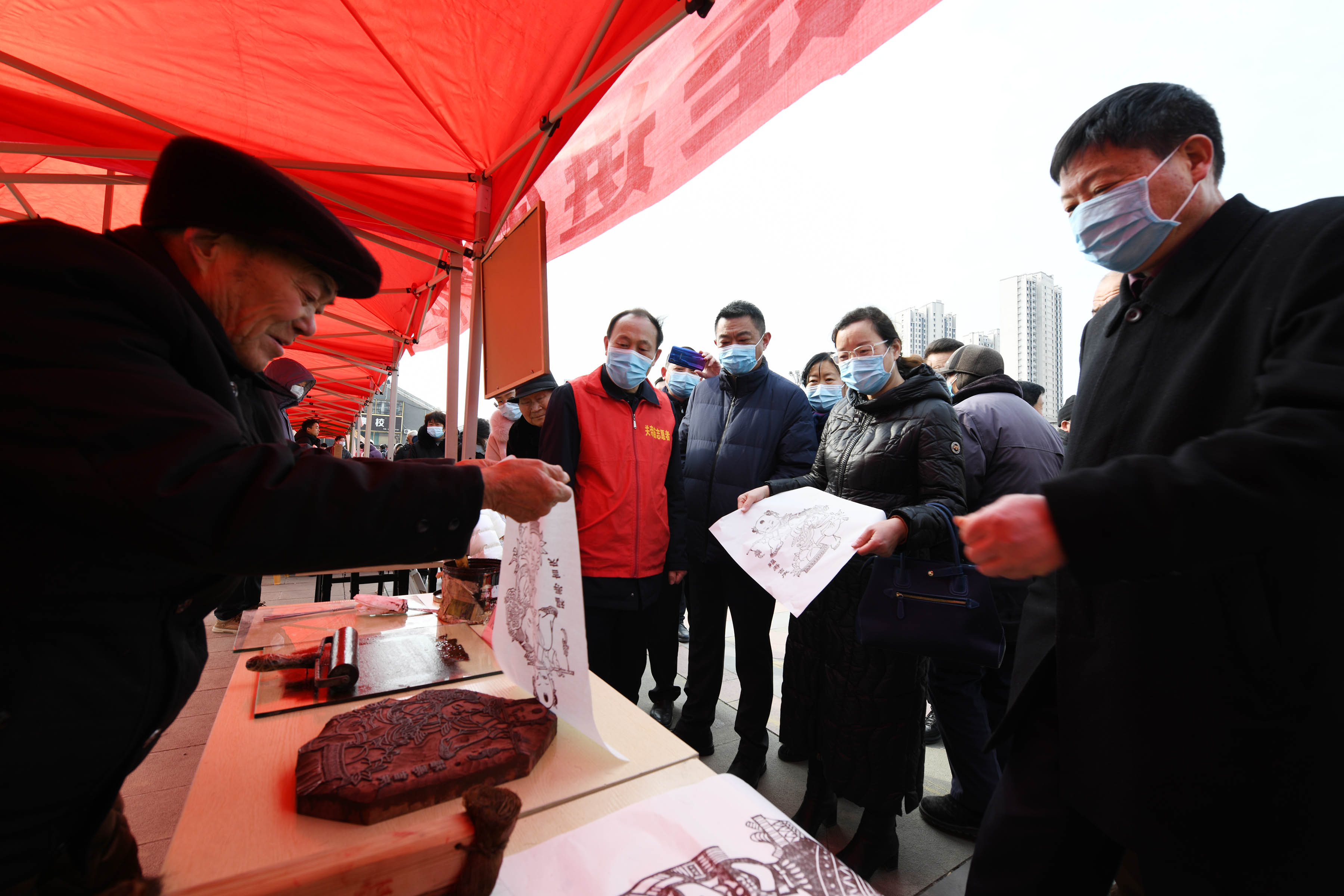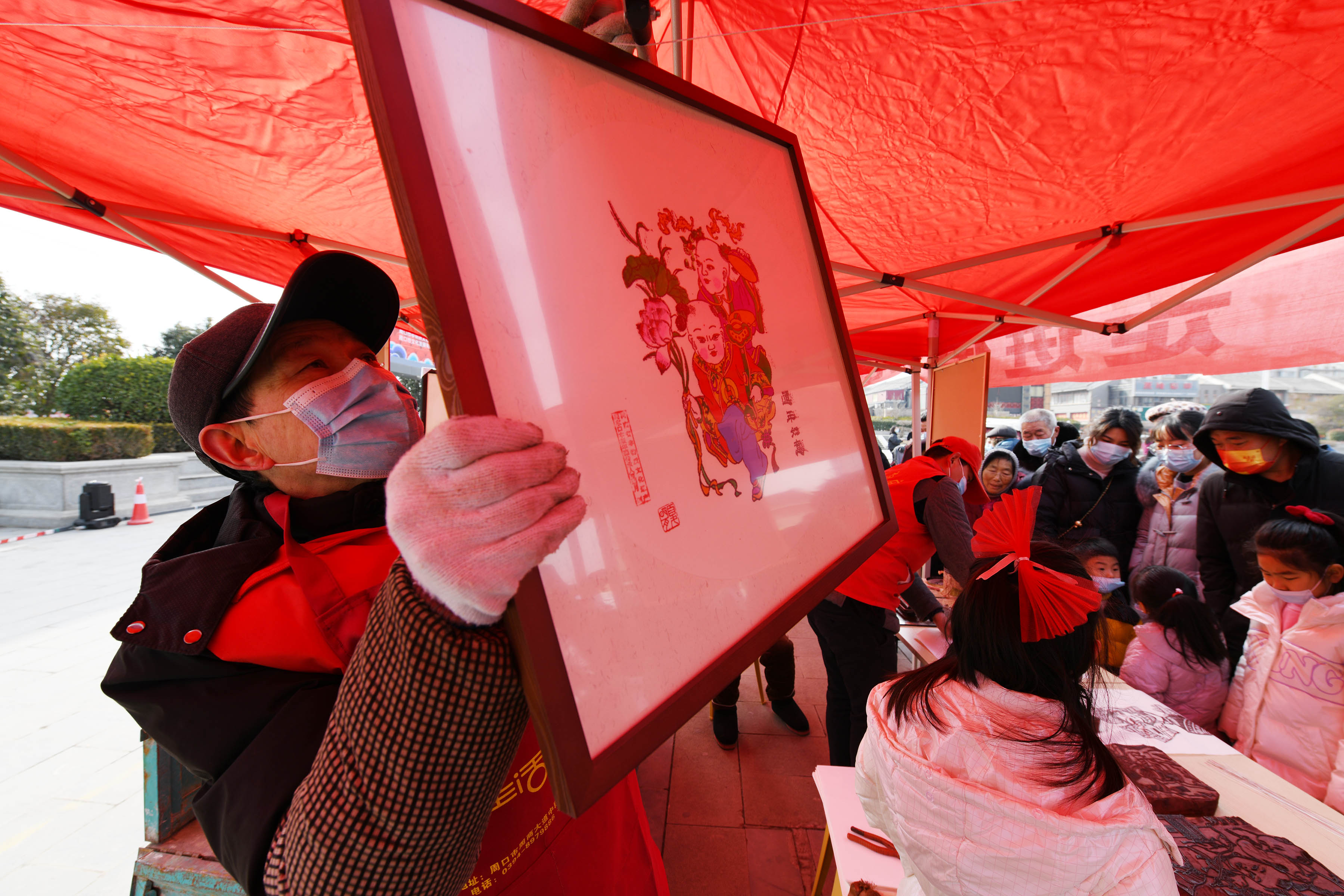 非遗传承人穆广科向市民展示木版年画
