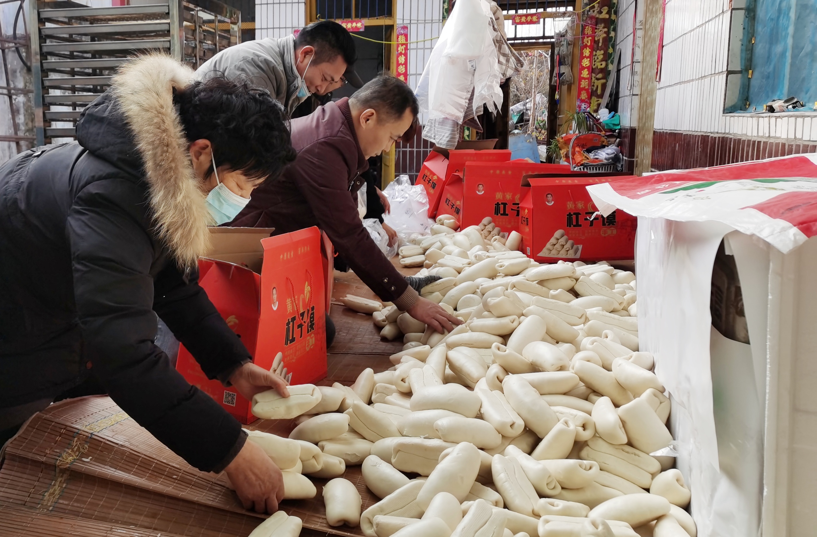 小伙子姓黄,20岁,他的父亲不能说话,是残疾人。赶到过年,店里非常忙碌,全家上阵制作杠子馍,小黄放假了就来店里帮忙。随着时代发展,现在和面、分面剂都有机器,蒸馍也有蒸箱,一次能出1000多个,少了烟熏火燎,进入智能化、高效化的轨道。但杠子馍由于形状特殊,加之过年期间需求量特别大,所以“做年馍”仍是辛苦活儿,需在头天晚上将面掺上酵子(方言,即含有酵母的面团,也叫引酵)和好,放在温暖处任其发酵。赶上年关这样的旺季,往往需要几十个人通宵达旦地加工,擀剂子、卷造型、二次发酵,彻夜不息。杠子馍干后不开裂,耐贮存,能放置一个月以上不变质,这是传统工艺与现代技术相结合的成果。“周口人过年哪儿有不备馍的?你们看我这边十来个箱子,每个箱子要装50多个馍,都是要装好寄到外地的,北京、上海的都有。”小黄说。