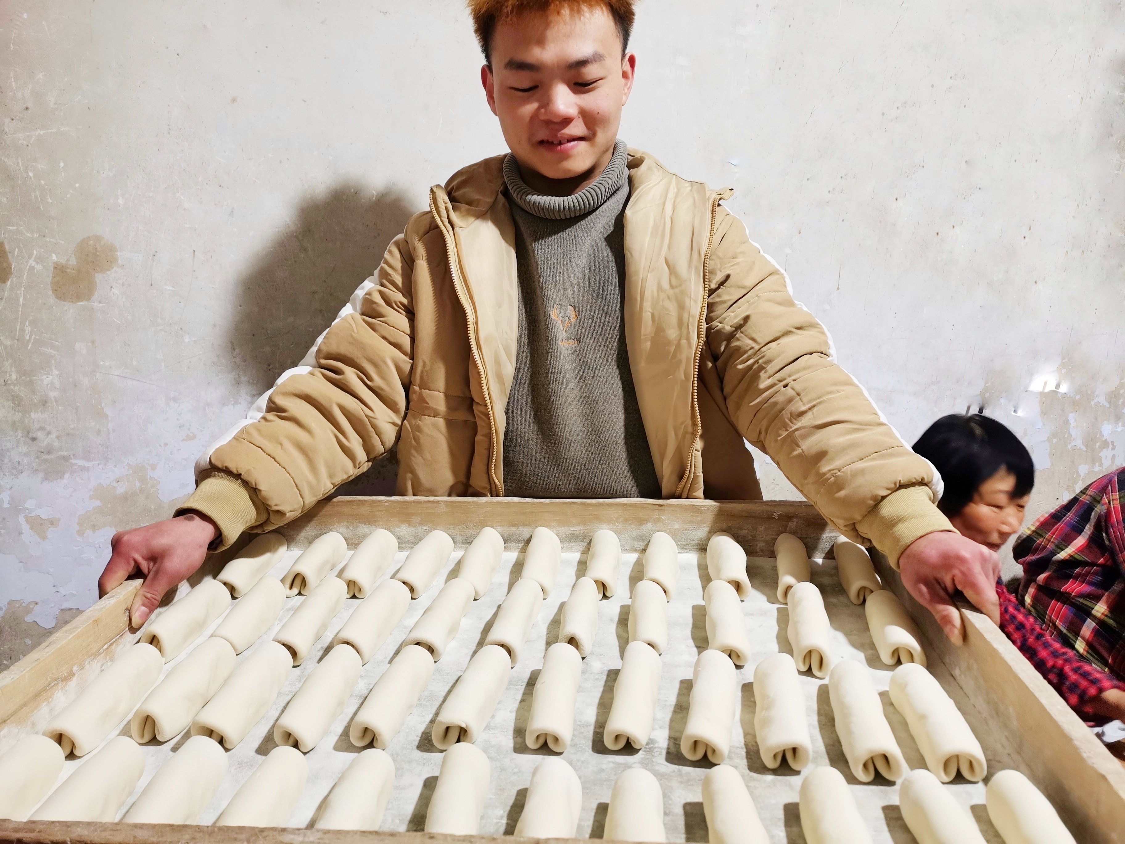黄家手工杠子馍店,小黄展示刚卷好的杠子馍,即将进蒸箱