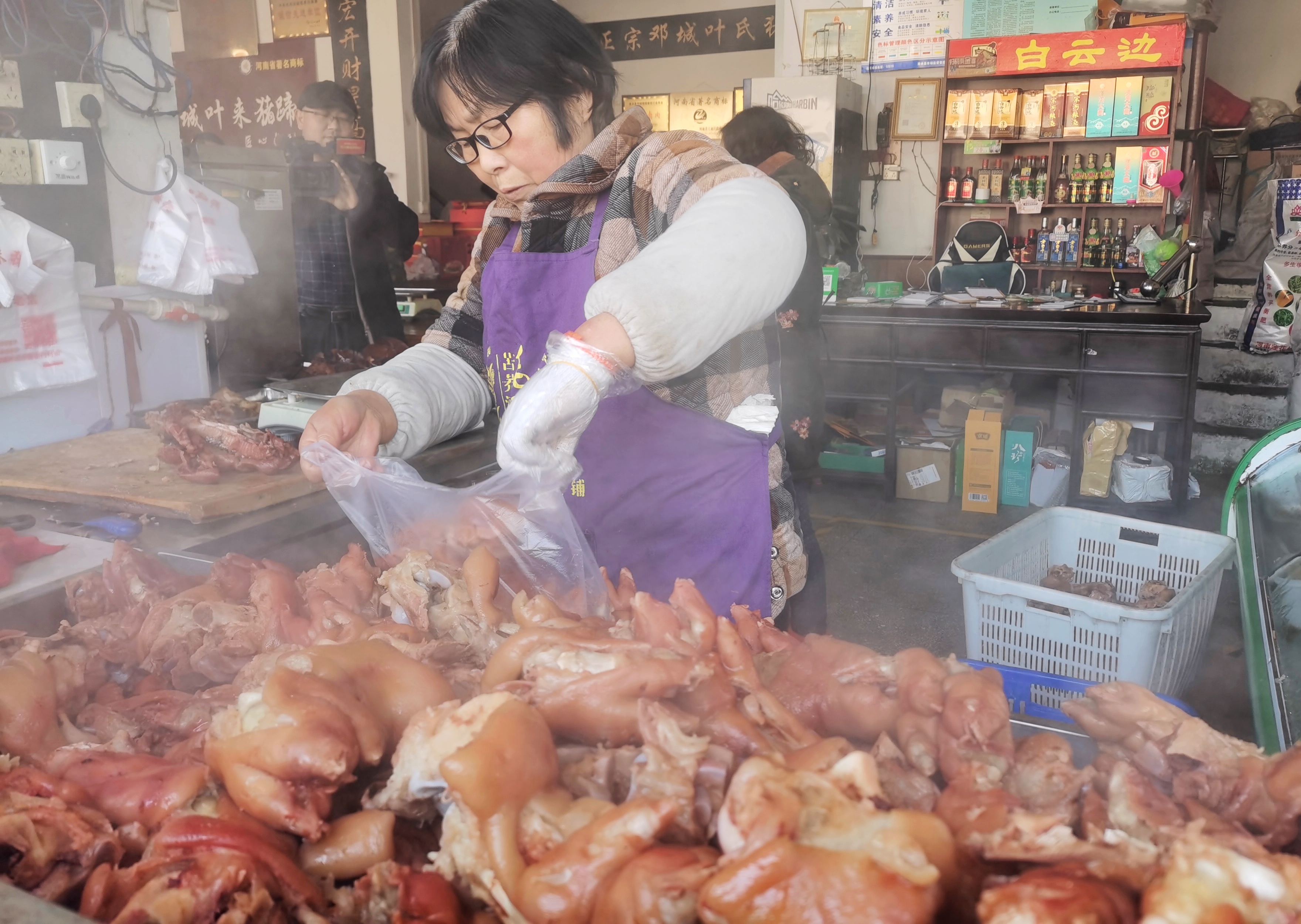 邓城叶来猪蹄老店,刚出锅的猪蹄是抢手货,即将端上新年餐桌