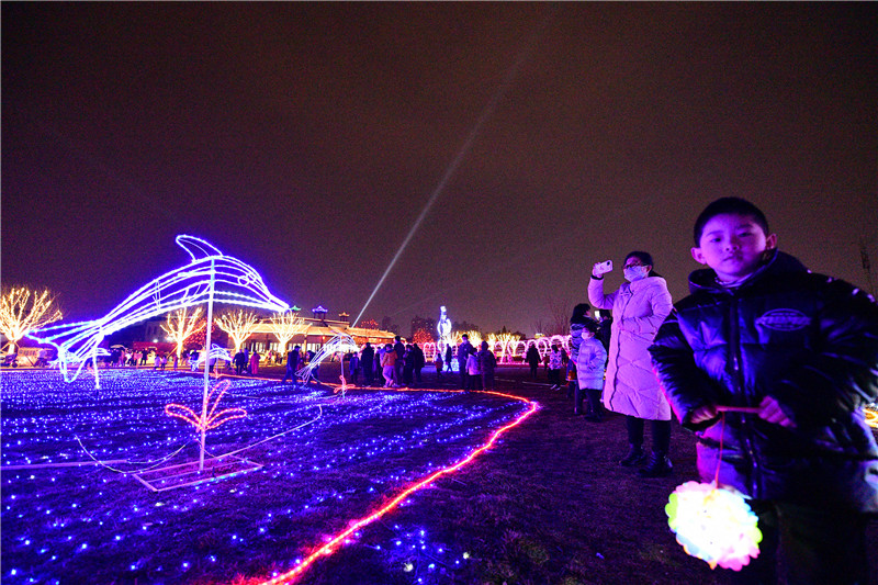 关帝庙东侧绿地布满各种彩灯造型