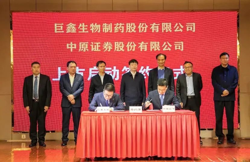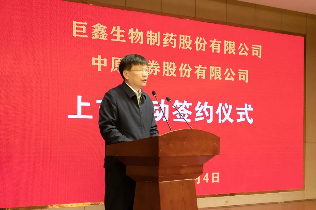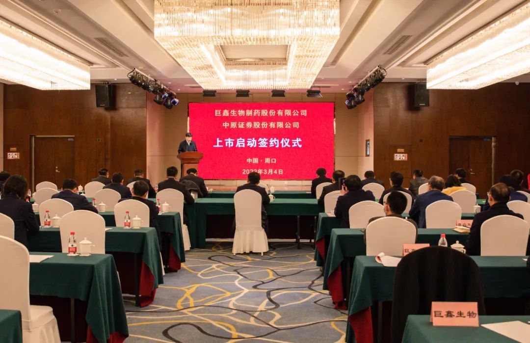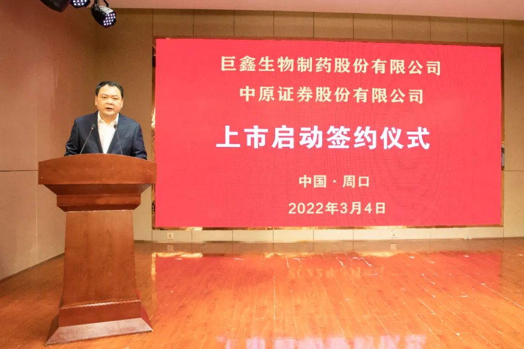 3月4日上午,巨鑫生物制药股份有限公司上市启动签约仪式在周口举行。市委常委、常务副市长马剑平出席签约仪式并致辞,副市长吴兵,中原证券股份有限公司党委委员、总会计师李昭欣,市金融工作局局长牛正田,县委书记李全林,县长董鸿,县委常委、县委办公室主任陈强,县政府党组成员张仁杰等出席签约仪式。