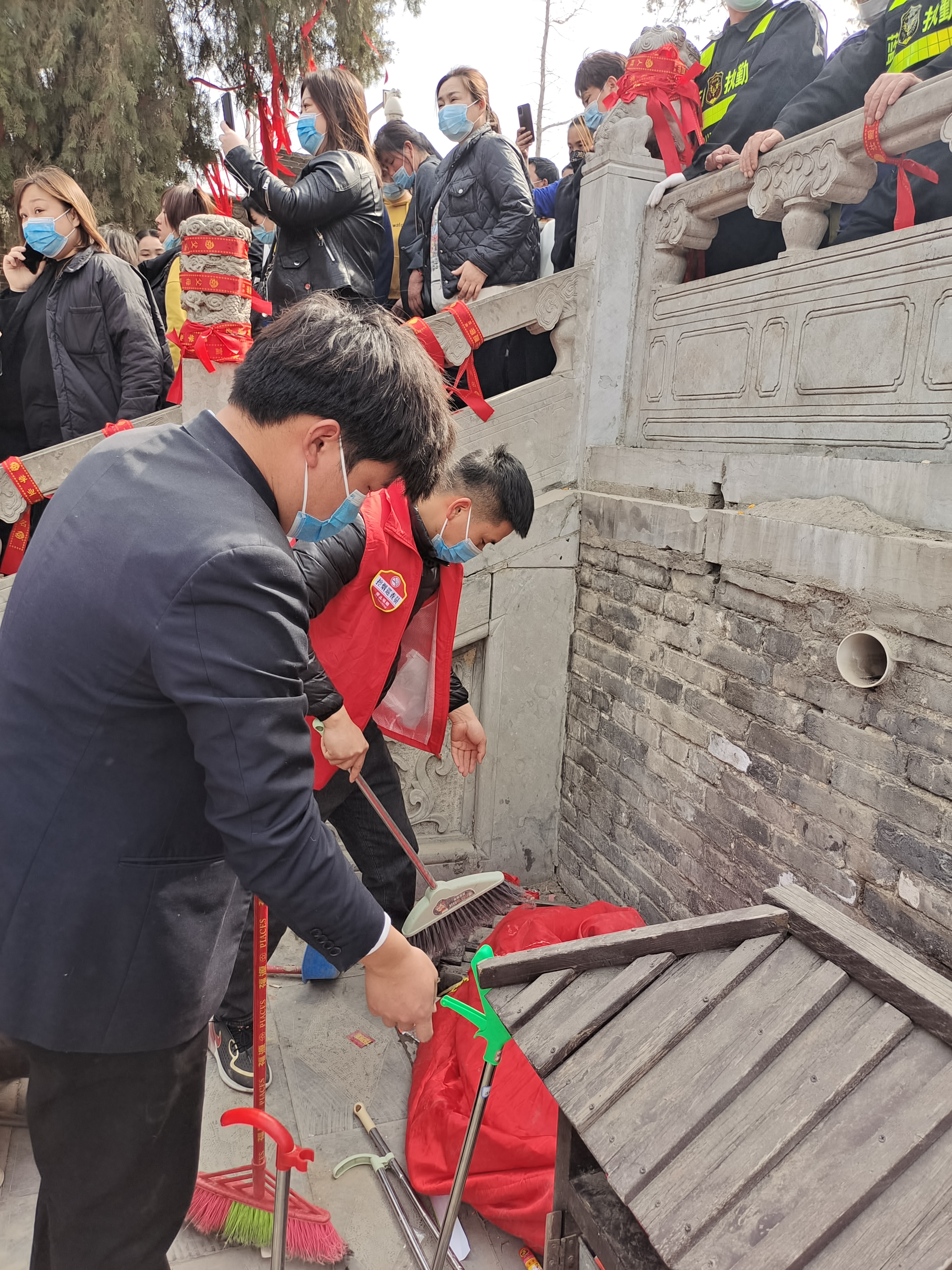在伏羲陵墓后的蓍草园周围,有人买红布条系在栏杆上祈福,有人虔心祝祷。当蓍草成为聚焦点时,有人却拿着打扫工具默默清理垃圾,让蓍草园成为一方“净土”。见他们身穿红马甲,记者上前询问,原来是来自建业物业的志愿者,其中一名叫李小宇,他说太昊陵已经成为淮阳门面,要做好卫生,把太昊陵的良好形象维持住。“我们都是自愿前来,让家乡父老不论啥时候都看到一个干干净净的太昊陵!”李小宇说。