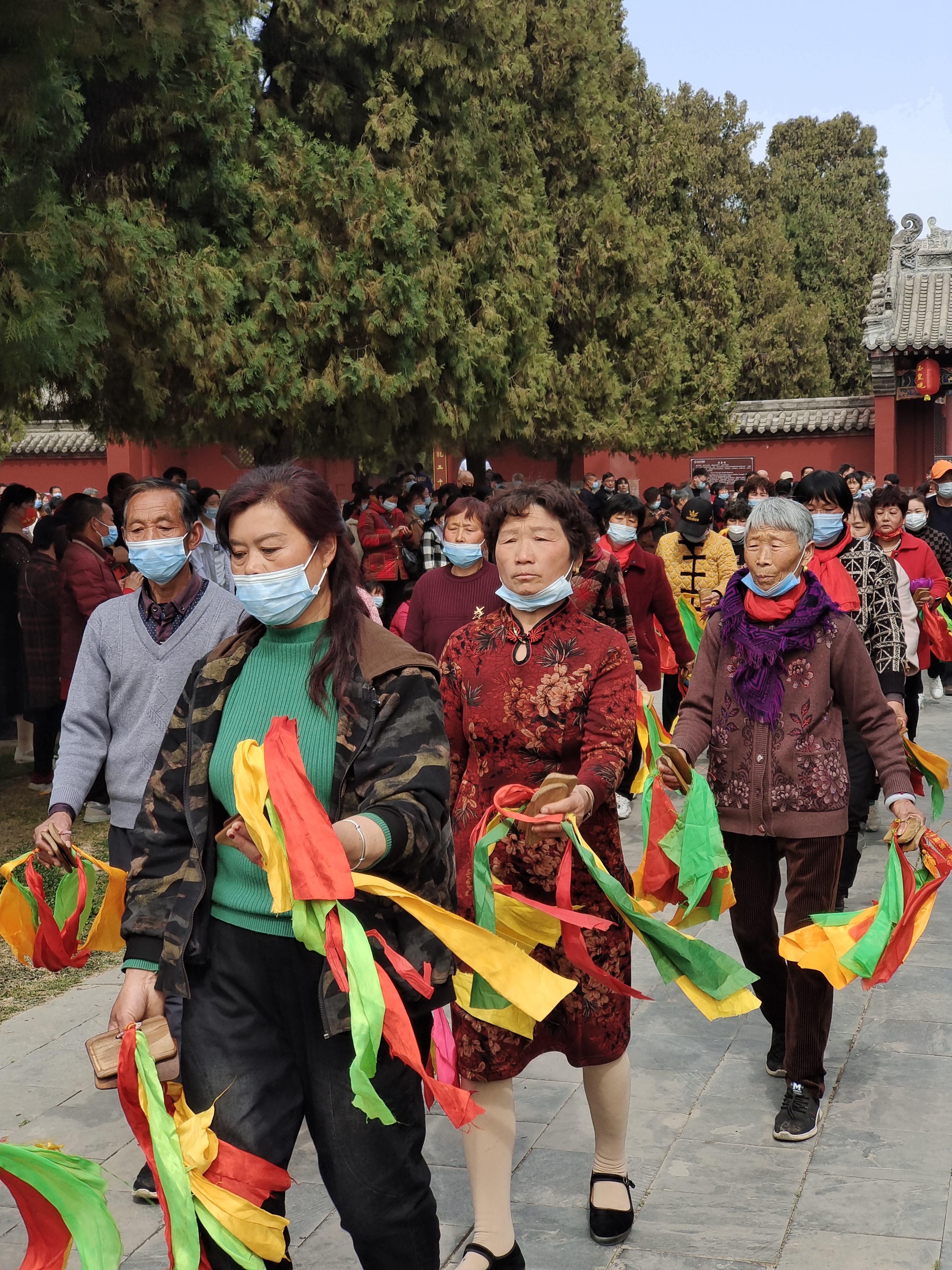 在疫情防控背景下,太昊陵中的子孙窑和岳飞观暂时关闭。人们路过“子孙窑”时,会不自觉摸摸墙角;路过岳飞观时,会双手合十,带孩子的会讲岳飞的故事。变化之中,一些不变的照常进行:往碑刻上贴硬币,祈求好运;站在千年耳柏前,向人祖伏羲低声诉说着心事;绕伏羲大墓一周,添一把土……在淮阳区各职能部门的努力下,这一古老又现代的盛会平稳又精彩地运行着。②5