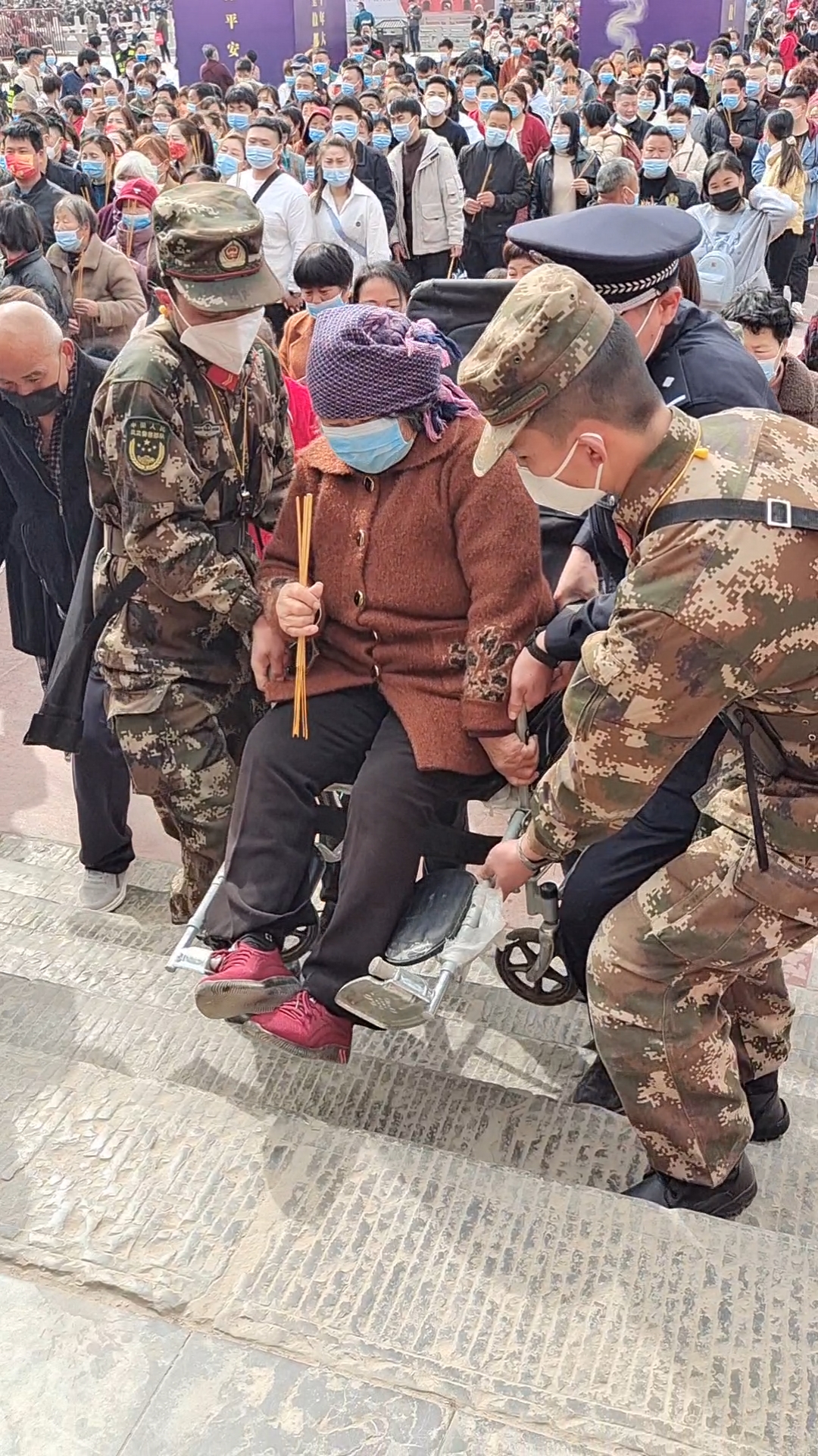 只要看到有腿脚不便的人上台阶不方便,附近的人民子弟兵立刻快步上前,扶上台阶。一位坐轮椅的老太太进不去午朝门,3位武警官兵、一名警察以及热心群众齐心协力抬起轮椅,稳稳地把老太太抬进门里。不等被帮助的人说声“谢谢”,这些子弟兵就快速回到岗位,有人说他们戴着口罩看不到模样,想知道他们的名字,他们说:“名字不重要,为人民服务最重要!”