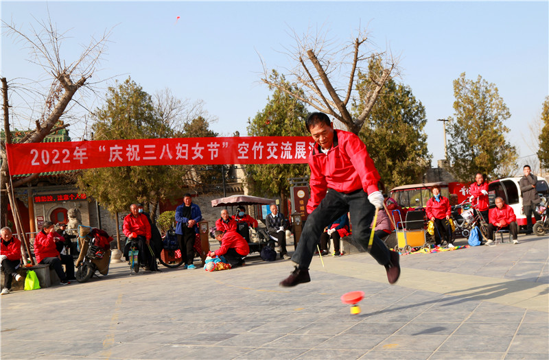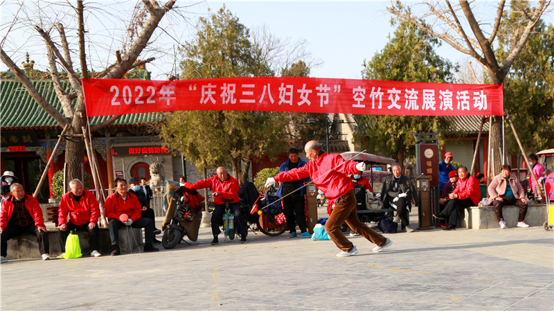 3月8日,周口市空竹运动协会在周口关帝庙广场举行庆祝“三八”国际妇女节空竹交流展演活动,20多名空竹爱好者相继表演了空竹运动的各种技法,让现场群众大开眼界。
