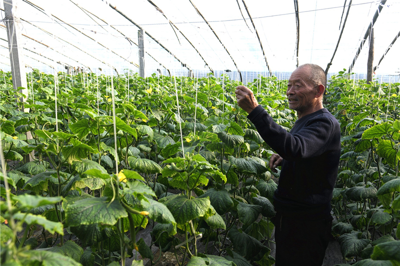 扶沟县柴岗乡梅桥村是远近闻名的黄瓜种植专业村,全村1200亩土地上建有1100亩蔬菜大棚,最多的一户村民有大棚10多个,亩均效益5万多元,黄瓜种植成为当地乡村振兴的好产业。图为昨日70多岁的脱贫户梅铁棍在帮助儿子管理黄瓜。