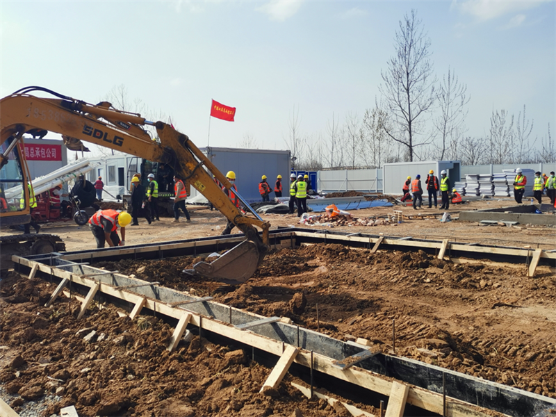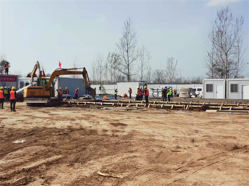 段科介绍,昨日已完成地表清理和基础处理工作,今天主要工作是浇筑混凝土,地面硬化,同时开始隔离房安装工作。“要不是多方协调,我们也不可能这么快,多亏了太康县住建、电力、公安等部门的配合协调,我们从外地调配的物资才能顺利进入施工场地,我们才能昼夜不停顺利施工。”