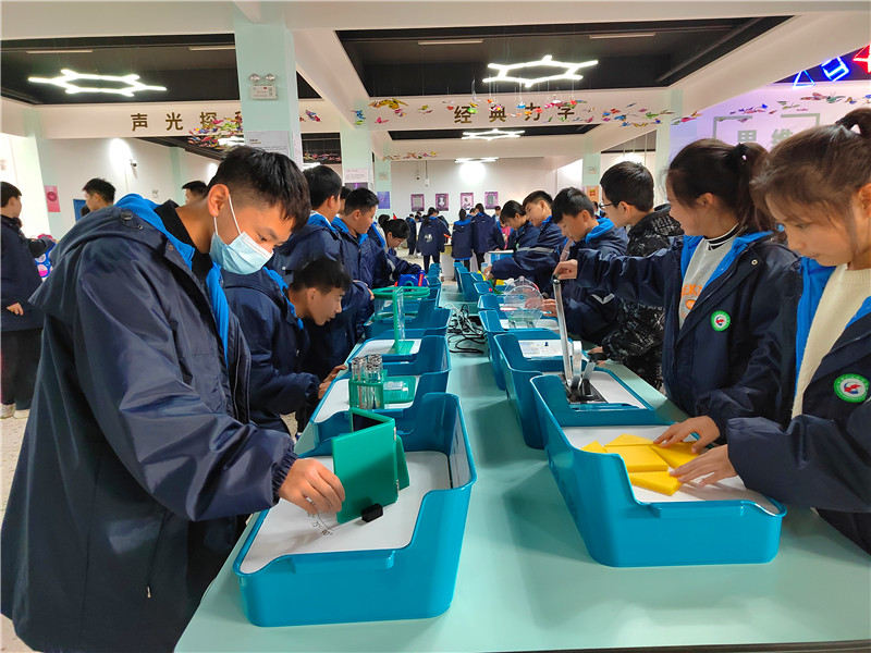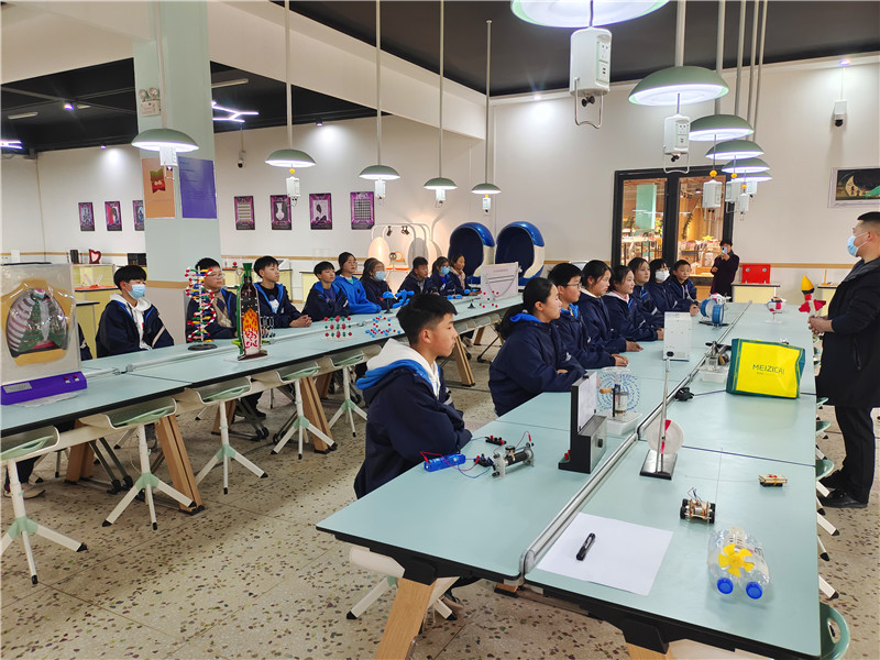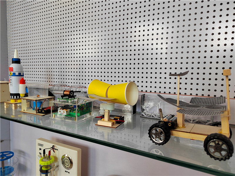 走进学校科技馆,科技社团的学生在老师杨建华指导下,认真地斟酌月球车的制作步骤,将一个个零散的部件组装成完整的月球车模型。在该校科技馆青少年科普研究中心作品展览区里,有序地摆放着科普老师和同学们制作的密码箱、月球车、火箭发射模型、雷达模型、电磁炮、特斯拉线圈、电动机模型、机器人、机器手臂、密码编程箱、掌控板、3D打印……琳琅满目的作品让人惊叹不已。