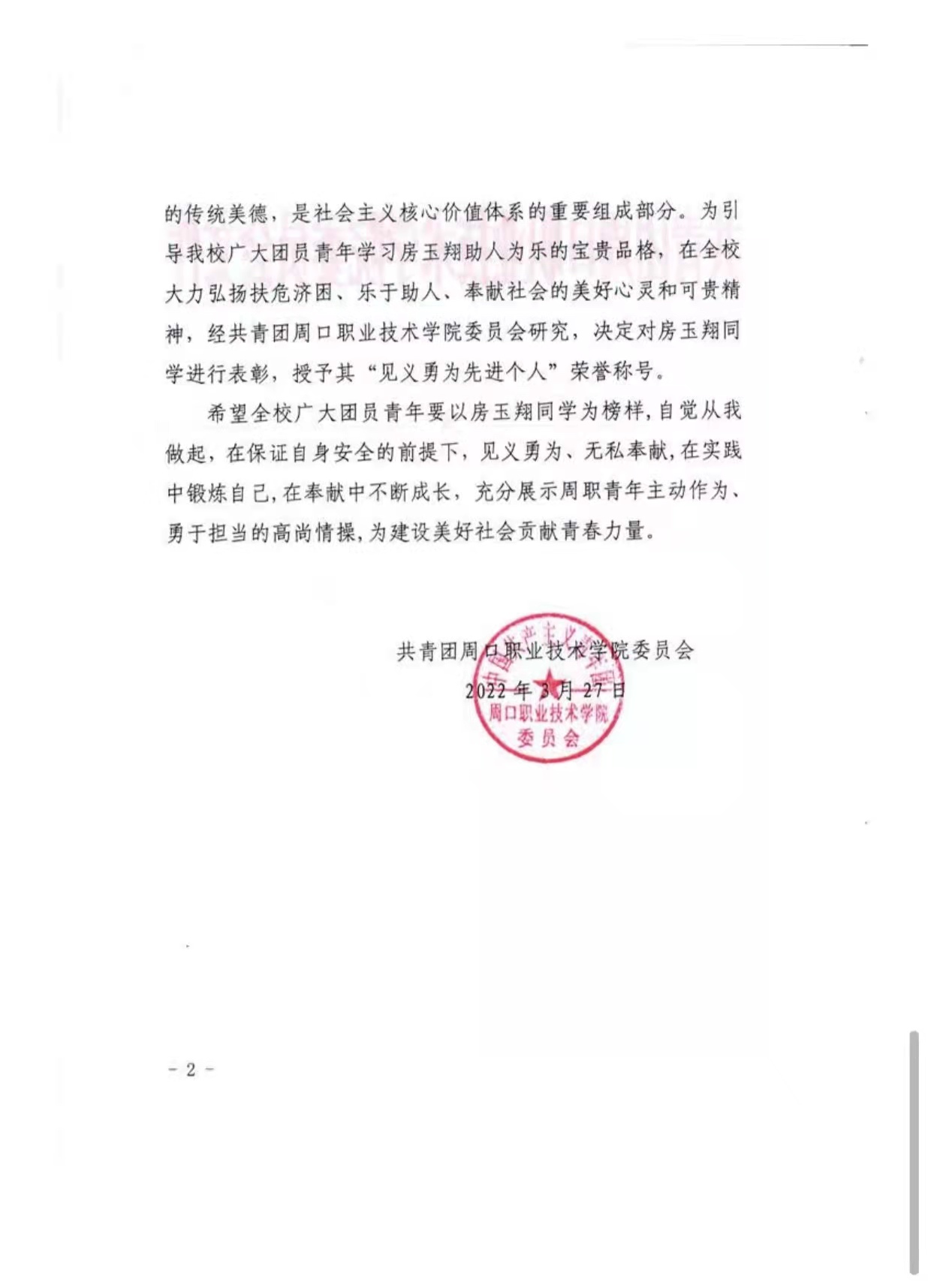 同时,房玉翔救人事迹也在他就读的周口职业技术学院引发强烈反响。“房玉翔同学的救人事迹,体现了当代青年大学生的优秀品质和精神风貌,我们为拥有这样的学子感到自豪!”周口职业技术学院宣传部部长皇甫超说。目前,共青团周口职业技术学院委员会决定授予房玉翔同学“见义勇为先进个人”荣誉称号,号召全校广大团员青年向房玉翔同学学习,学习他主动作为、勇于担当的高尚情操,为建设美好社会贡献青春力量。①2