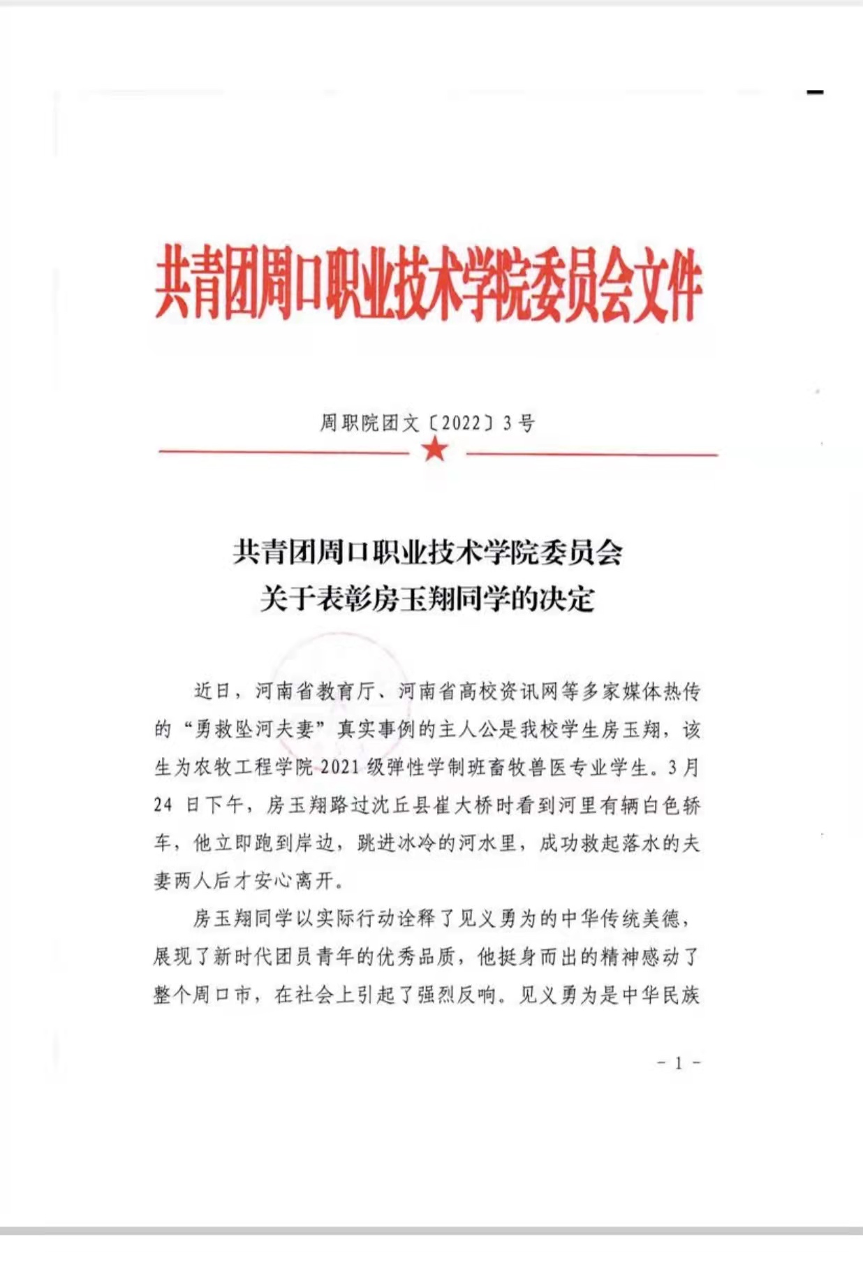 周职学子好样的,为房玉翔点赞!3月26日“周口日报”抖音号和3月29日《周口日报》对周口小伙房玉翔跳河救人的事迹报道后,引发社会强烈反响。