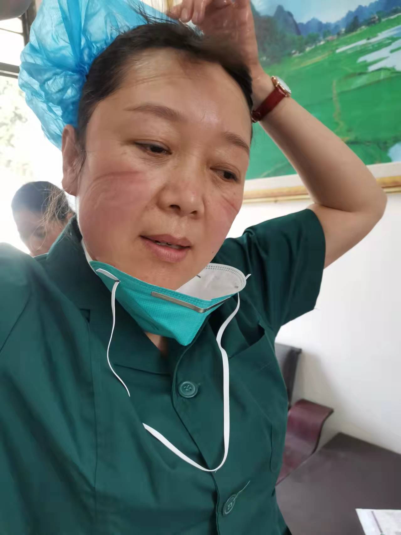10多天来,雷雪玲总是早出晚归,穿着厚厚的隔离服,戴着橡胶手套、防护眼镜、帽子和面罩,套着过膝的脚套,连续工作数十个小时,期间不能上卫生间、不能喝水,甚至不能擦擦汗。天气寒冷,但是一天工作下来,她总是被厚厚的防护服闷得汗流浃背,手被泡得发白,脸上也被口罩勒出层层痕迹,加上本来就患有心脏病的她,经常会体力不支,但是她却不顾病痛的折磨,从未请过一次假,每天都坚持带病入户采样。晚上工作结束,她的双腿已经麻木,也顾不上休息片刻又匆忙准备第二天检测需要的试剂,有时为了方便早上出发,她直接和衣而卧。她的这种不怕苦,不怕累,舍小家为大家的牺牲精神深深感动着每一位医护人员!