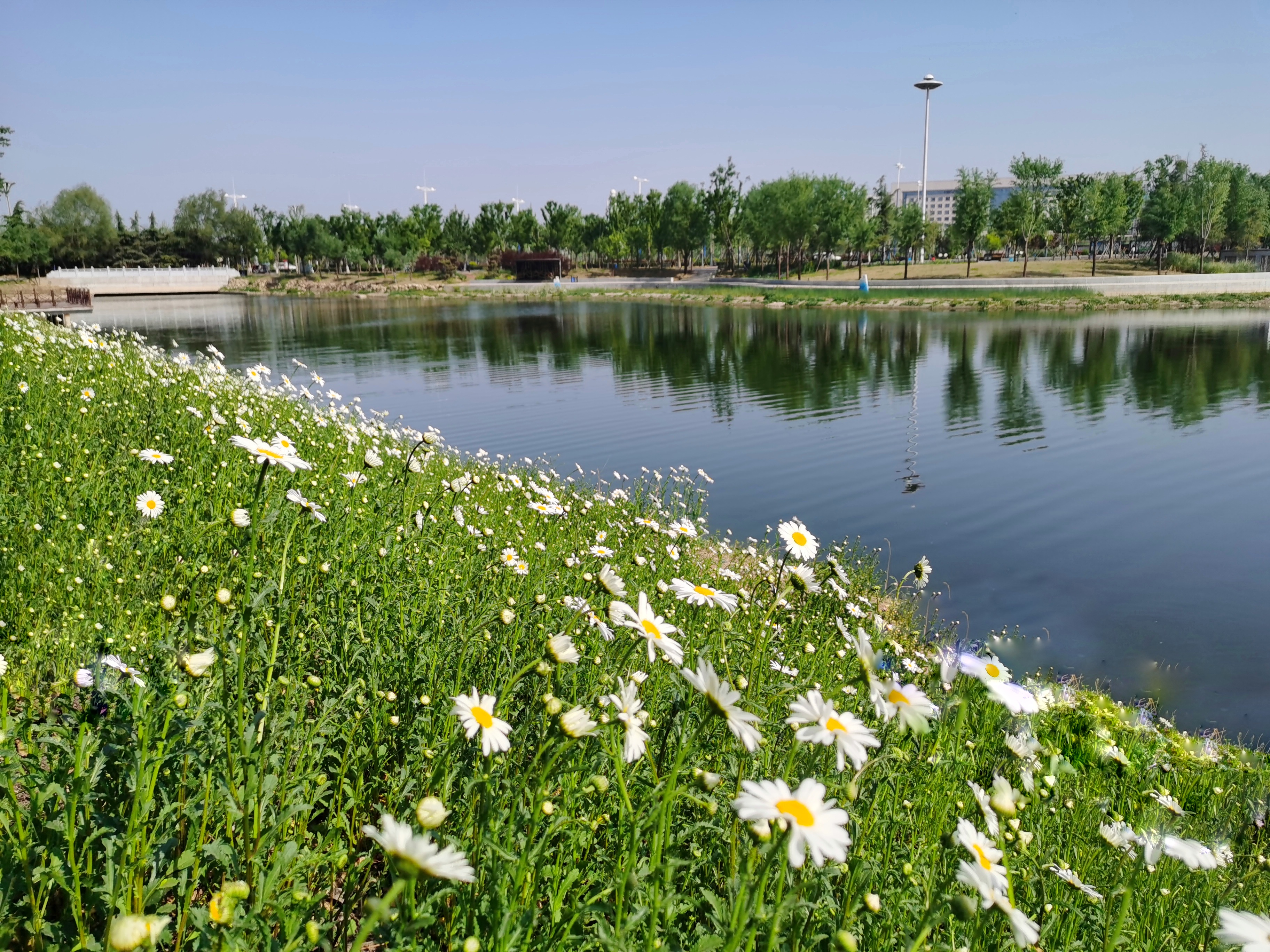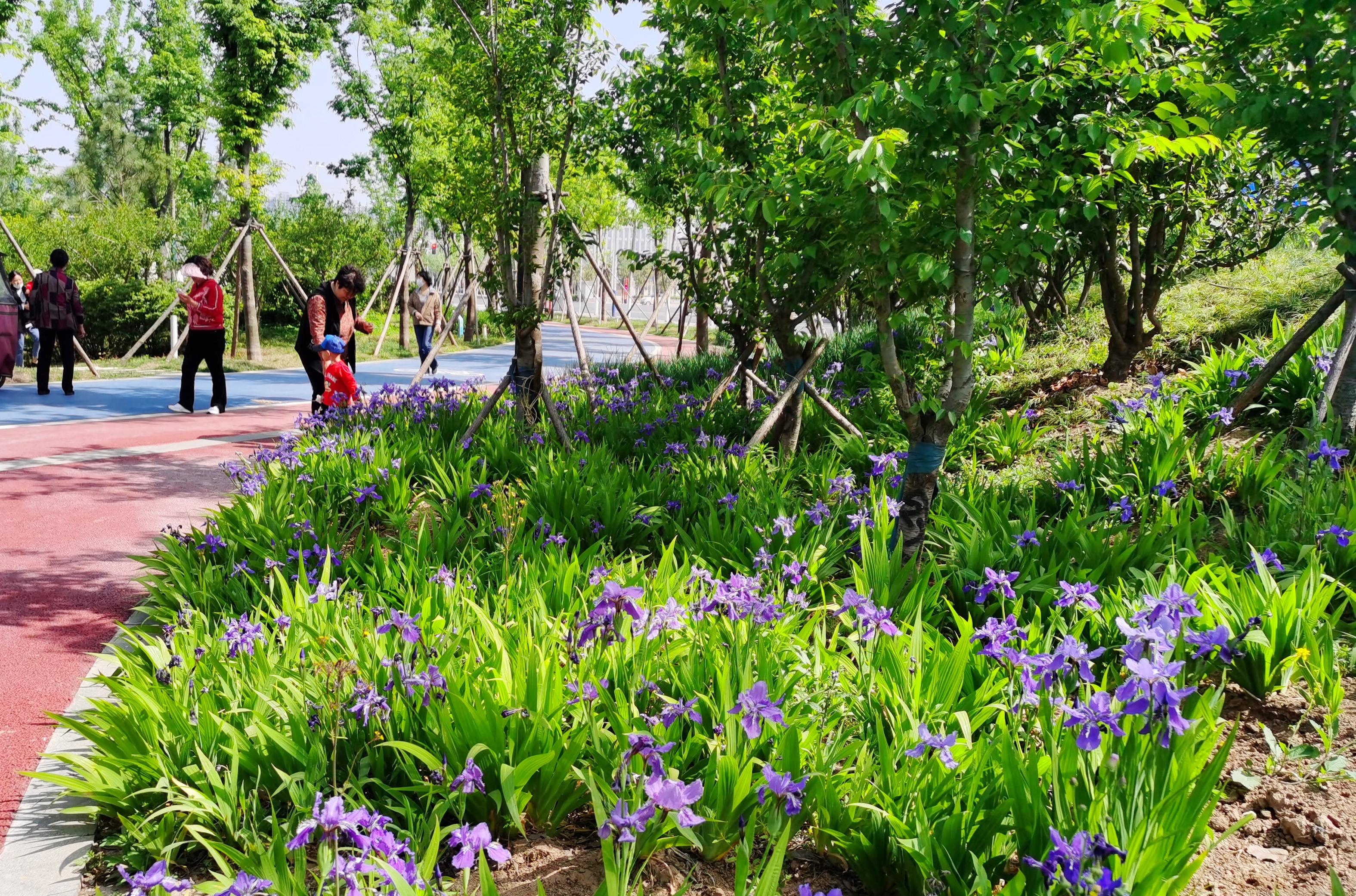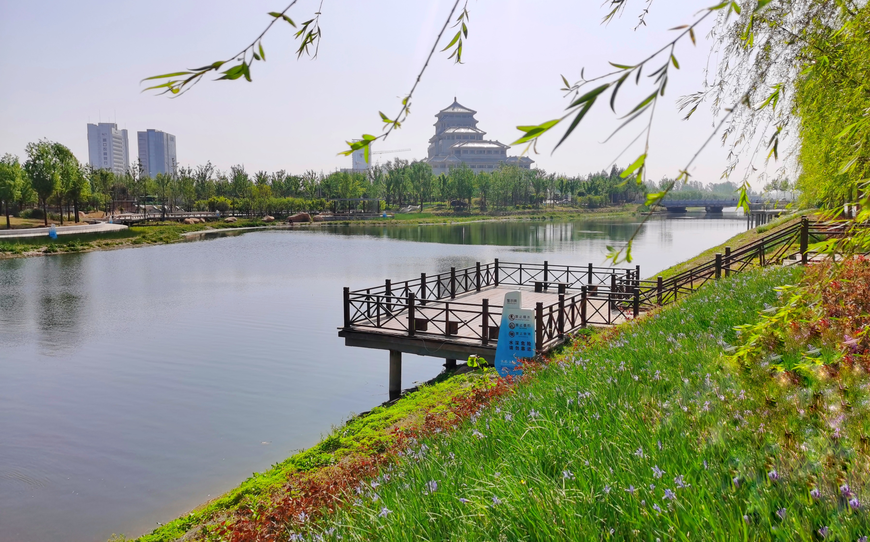 4月21日, 春光明媚,水清草绿,蜿蜒流淌的洼冲沟倒映着蓝天白云、绿柳红花,市民们或在广场结伴游玩,或在亲水平台观河看景,一幅人与自然和谐温馨画卷呈现。