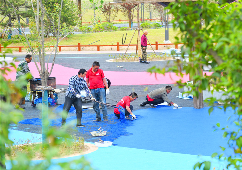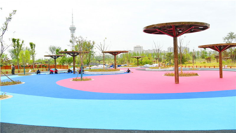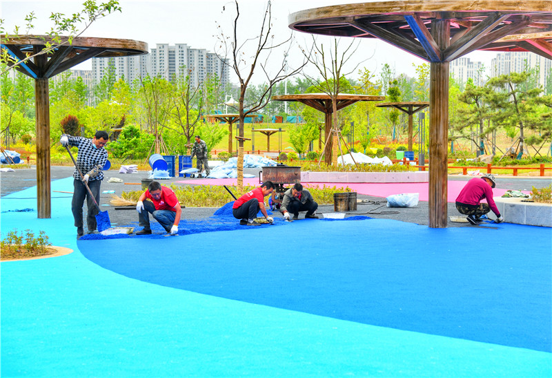 4月28日,周口沙颍河湿地公园内工人正在游乐场所铺七彩塑胶地面。据施工人员介绍,铺彩色塑胶地面需要二十多天时间,为了保证施工质量,希望市民在施工期间不要进入施工场地。③10