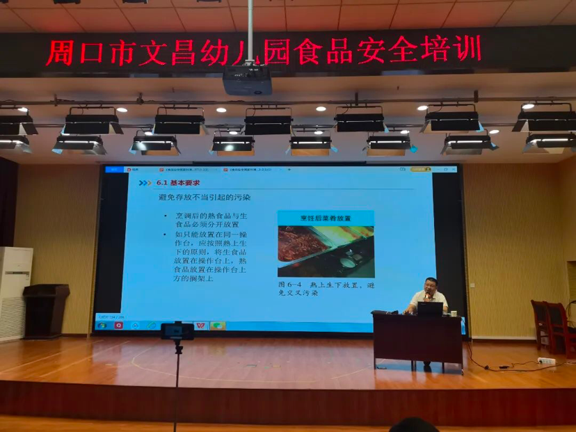 民以食为天,食以安为先。为规范食品安全管理,确保幼儿身体健康,日前,周口市文昌幼儿园开展了食品安全培训。市市场监管局城乡一体化示范区分局餐饮监管科科长于景峰受邀进行培训。因疫情原因,为避免人员聚集,本次讲座由幼儿园伙房人员和保健医生现场参加培训,教师在家参加线上培训。