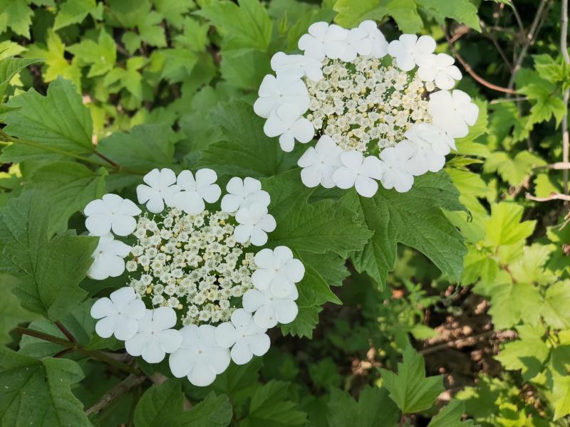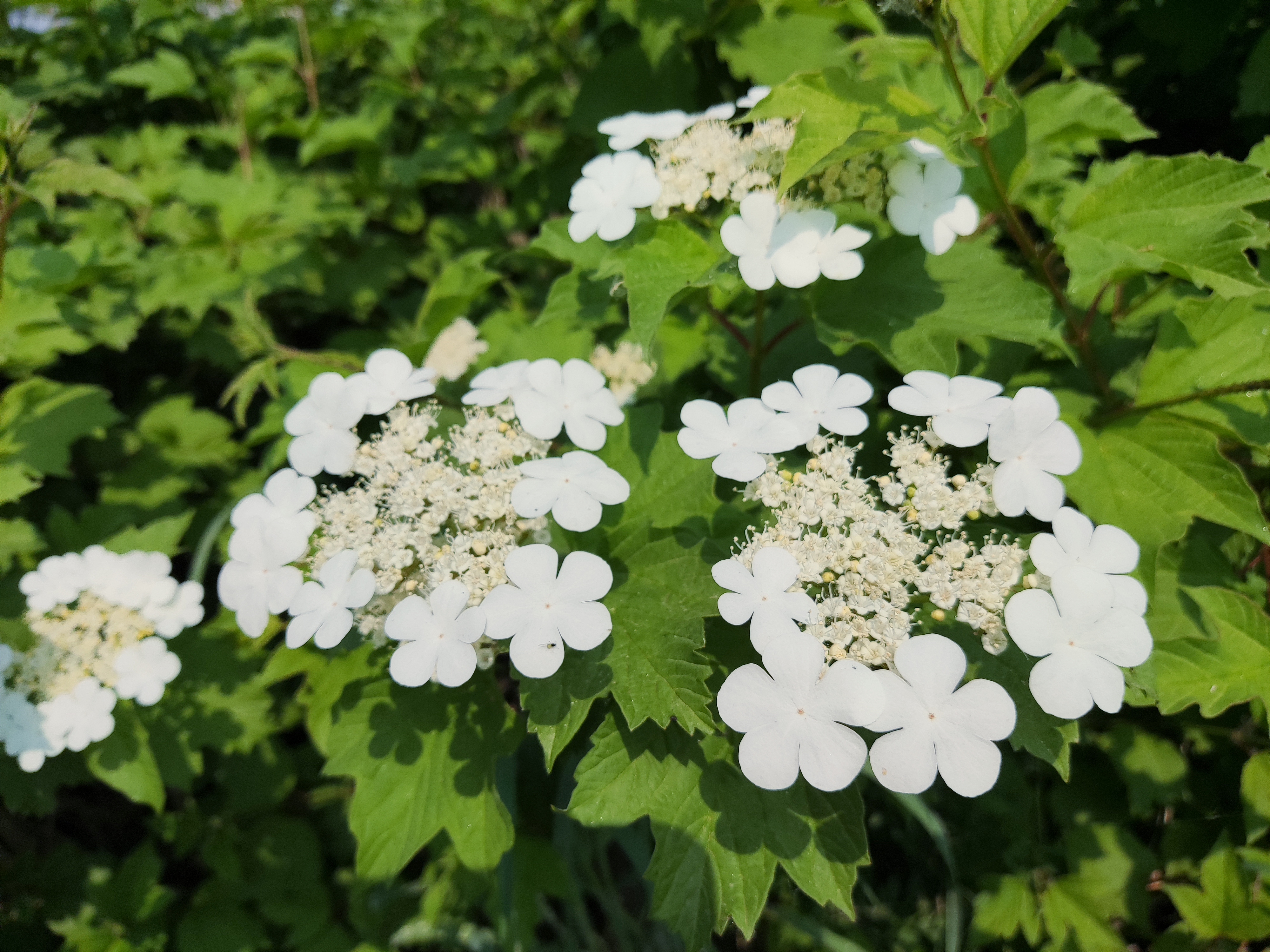 近日,滨河路上的天目琼花争相盛开,洁白似雪的团状花朵,格外清秀淡雅。
