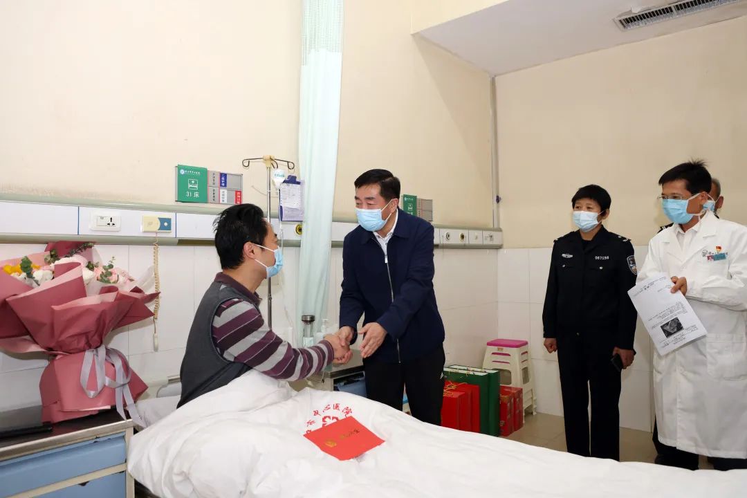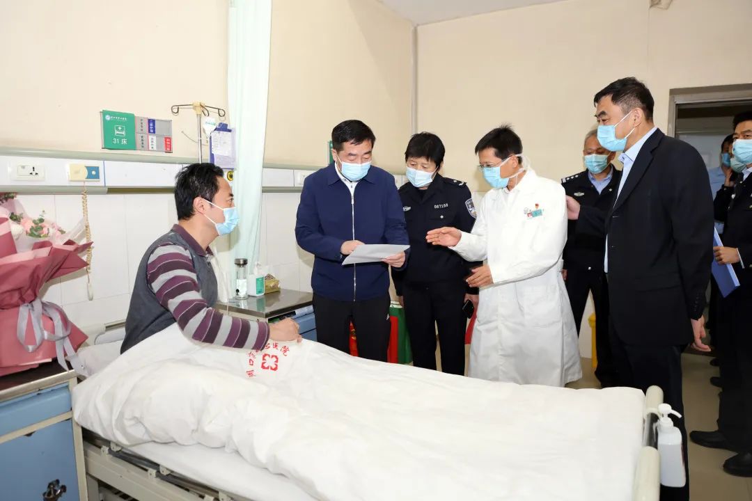 5月2日上午,副市长、市公安局局长张元明带着满满的牵挂和关爱,前往市中心医院看望慰问因连日奋战、病倒在抗击疫情一线的民警张巍,并送上了鲜花和慰问金,市公安局党委委员、政治部主任郭冰参加慰问。