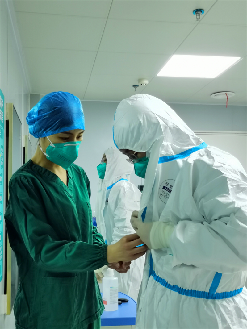 让一线医护人员在安全的环境工作和做好自身防护是“感控人”最重要的使命。刘琦严防死守,盯好队员的每一个动作,有污染可能的及时作出提醒纠正,在病房操作治疗过程中,及时监督和提醒每一位队员的手卫生执行,对遇到的问题当场解决。