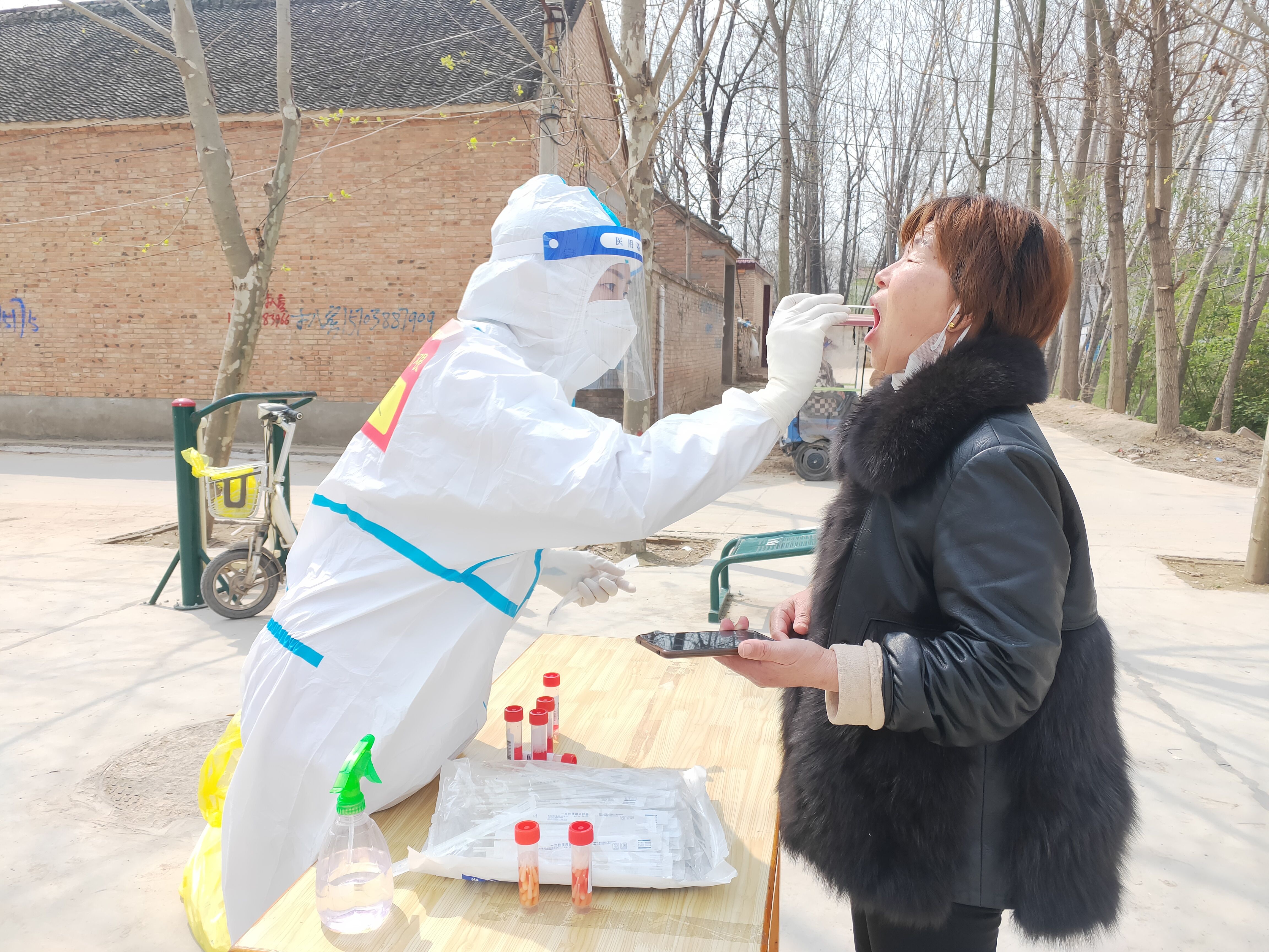 王文文和同事们于当日早7点到达太康广场进行培训。培训结束后,在对接人的引领下,王文文带领分队46人前往太康县张集镇开展支援工作,主要负责张集镇15个自然村,每日对近2万名群众进行核酸采集,他们分为15个组,一组负责一个采集点。第一天大家都没有经验,工作中,王文文不时接到其他组队员的咨询电话,王文文详细地为他们一一解答,保证工作顺利开展。