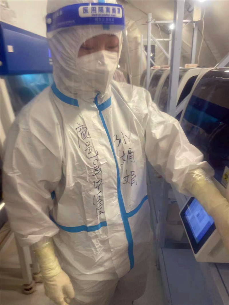 3月18日,孙娟娟及同事进驻了长春疫情最严重的九台区,随行的还有方舱实验室。次日,孙娟娟和同事们进行了防护培训,随即开始核酸检测实验。孙娟娟穿着密不透风的防护服,身心各种莫名的滋味都涌上来了。当她想到这每一个标本后面是一双双期盼的眼睛、一个个焦虑的家庭,她不禁为自己打气——加油!我们就是这场疫情的侦察兵,要把侦察到的情报准确无误地传递过去。