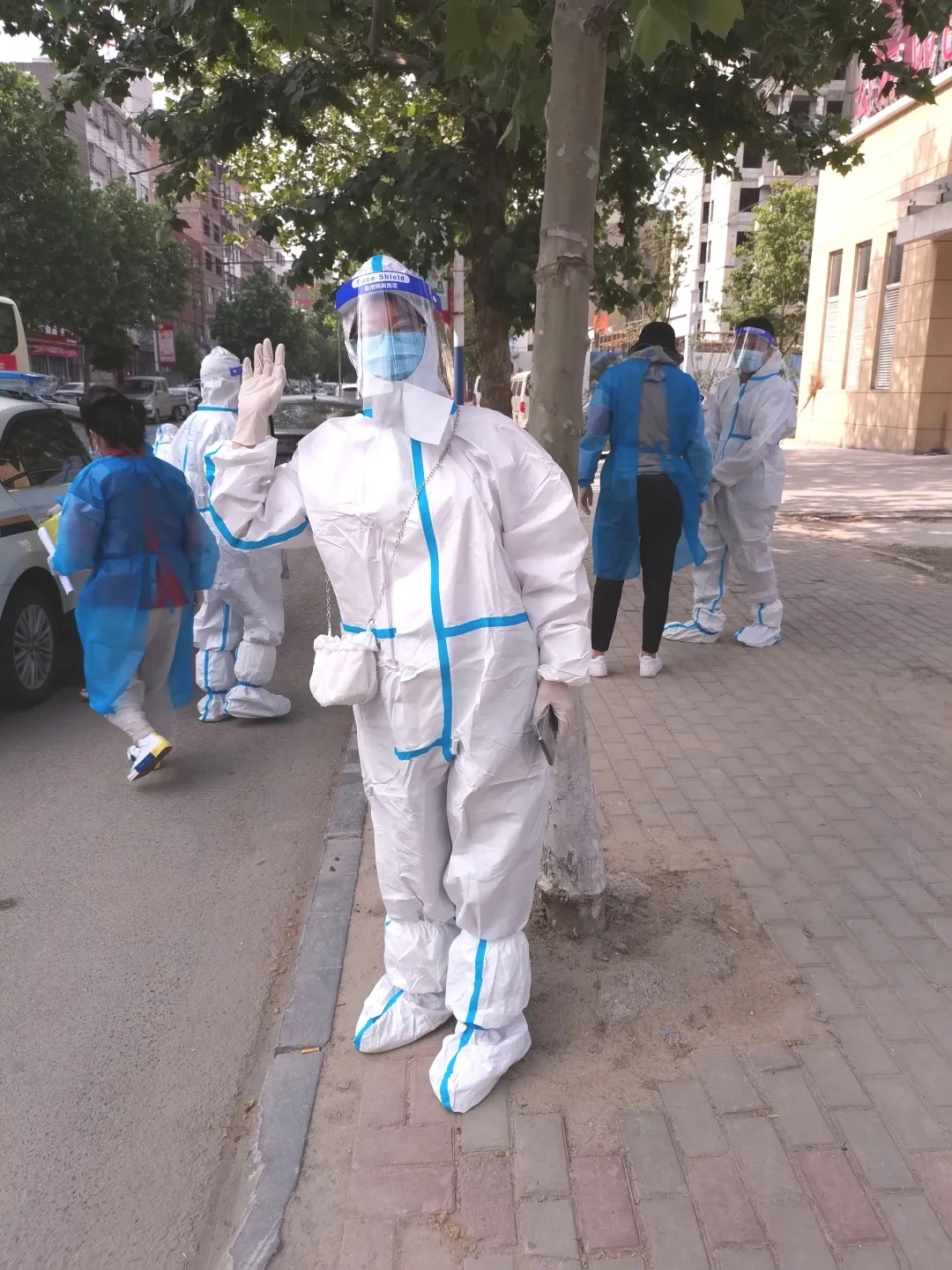 我们的任务是和周口市中心医院的医务人员,一起去给居民做核酸检测。我和战友们相互提醒做好防护,相互帮忙检查穿戴,相互喷洒酒精消毒。虽然这只是抗疫中最普通的一项工作,虽然我们只是志愿者,只能负责扫码和维持秩序,我和战友们还是争着去做近距离接触受检者的工作,争着承担更多风险。