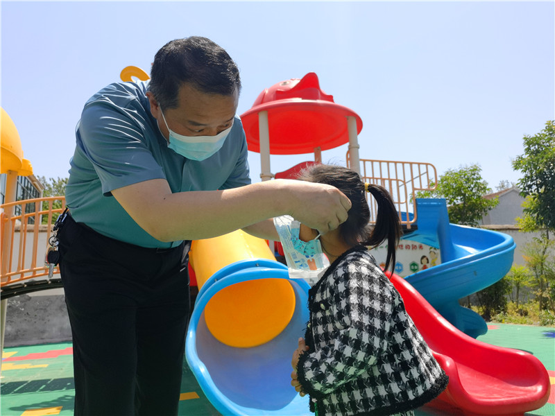 全民戴口罩,一个也不能少。许湾办事处程寺小学内设置了一个核酸采样点,该校93名学生在校内完成了核酸采样。看到有个别小朋友没有佩戴合适的口罩,该办事处主任聂永刚和其他工作人员从随身携带的“防疫包”中取出适合小朋友佩戴尺寸的专用口罩给他们戴好。“小朋友会佩戴口罩吗?要捏紧鼻子上方的位置,把小下巴兜起来。戴口罩是阻断空气中的病毒、细菌、飞沫的有效途径,保护我们的身体不受到侵害,出门要记得佩戴口罩!”工作人员在现场为小朋友们做示范,耐心细致讲解口罩的正确佩戴方式。