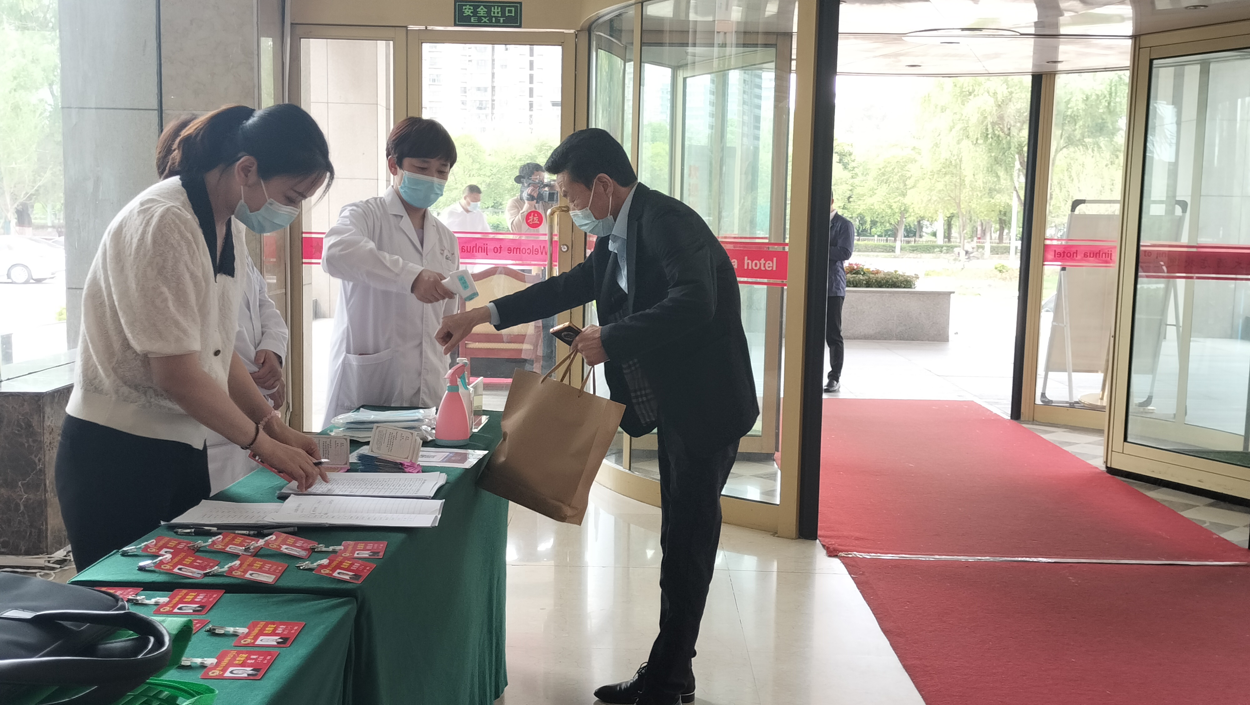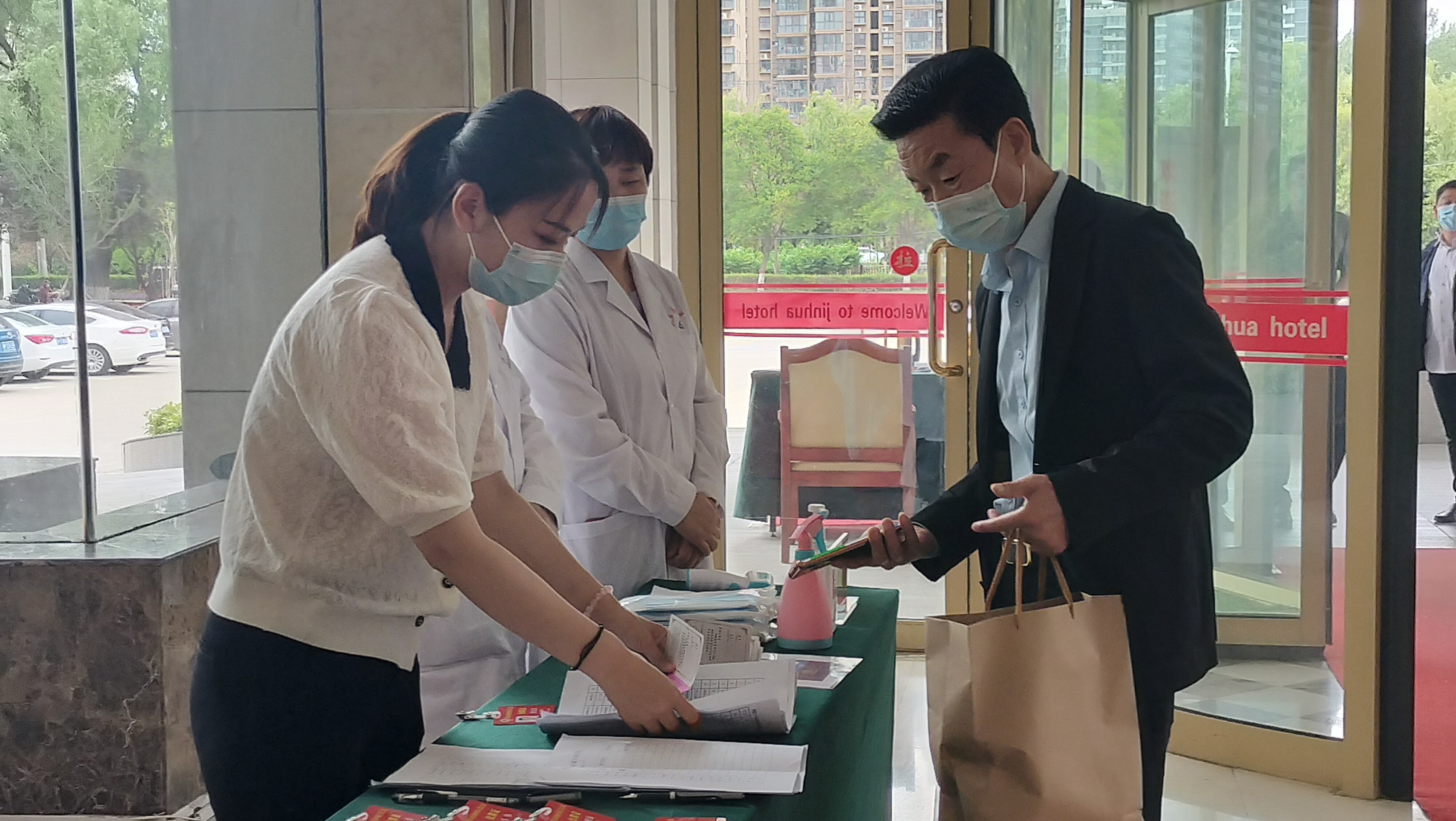 5月18日14时30分,在沈丘分会场参加政协周口市四届七次会议的委员陆续报到。图为一名政协委员在经过扫“周道办”场所码、测量体温后,步入分会场进行登记,领取资料。〈记者高洪驰摄〉