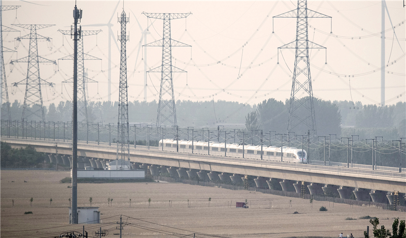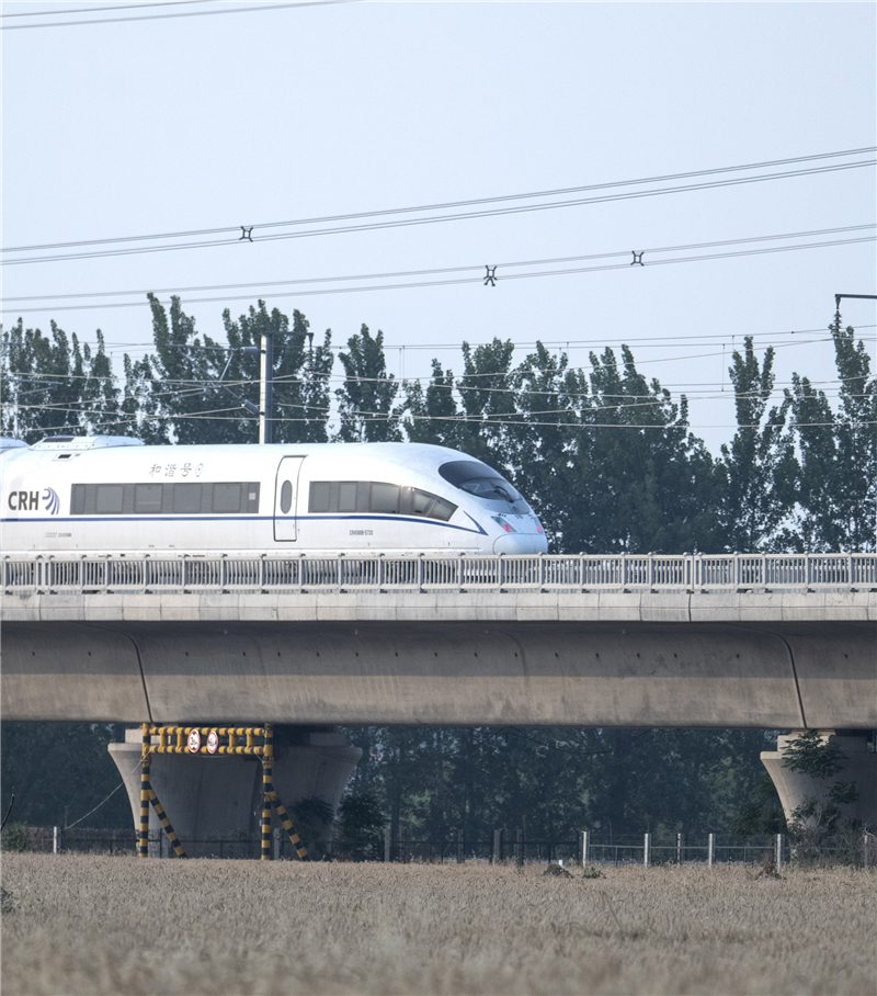 高铁列车行进在金色麦海