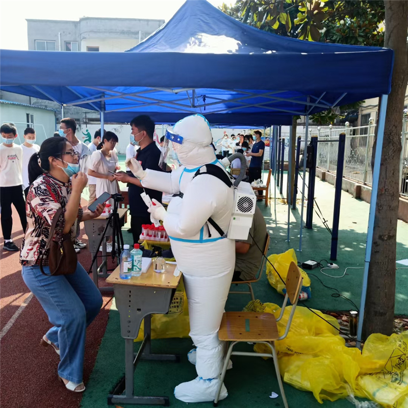 入夏以来,各地开展全员核酸检测,医护工作者穿着传统防护服密不透风,闷热难耐。5月31日,在项城市核酸检测点,这里的医护检测人员身上穿的智能控温医用正压防护服为他们带来了清凉。③9