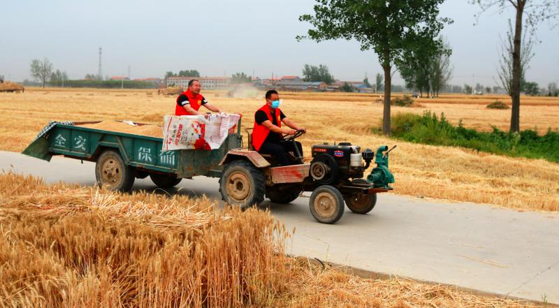 5月31日,扶沟县扶亭街道办事处小王庄村志愿者韩海洋(驾驶员)为村民运送小麦。