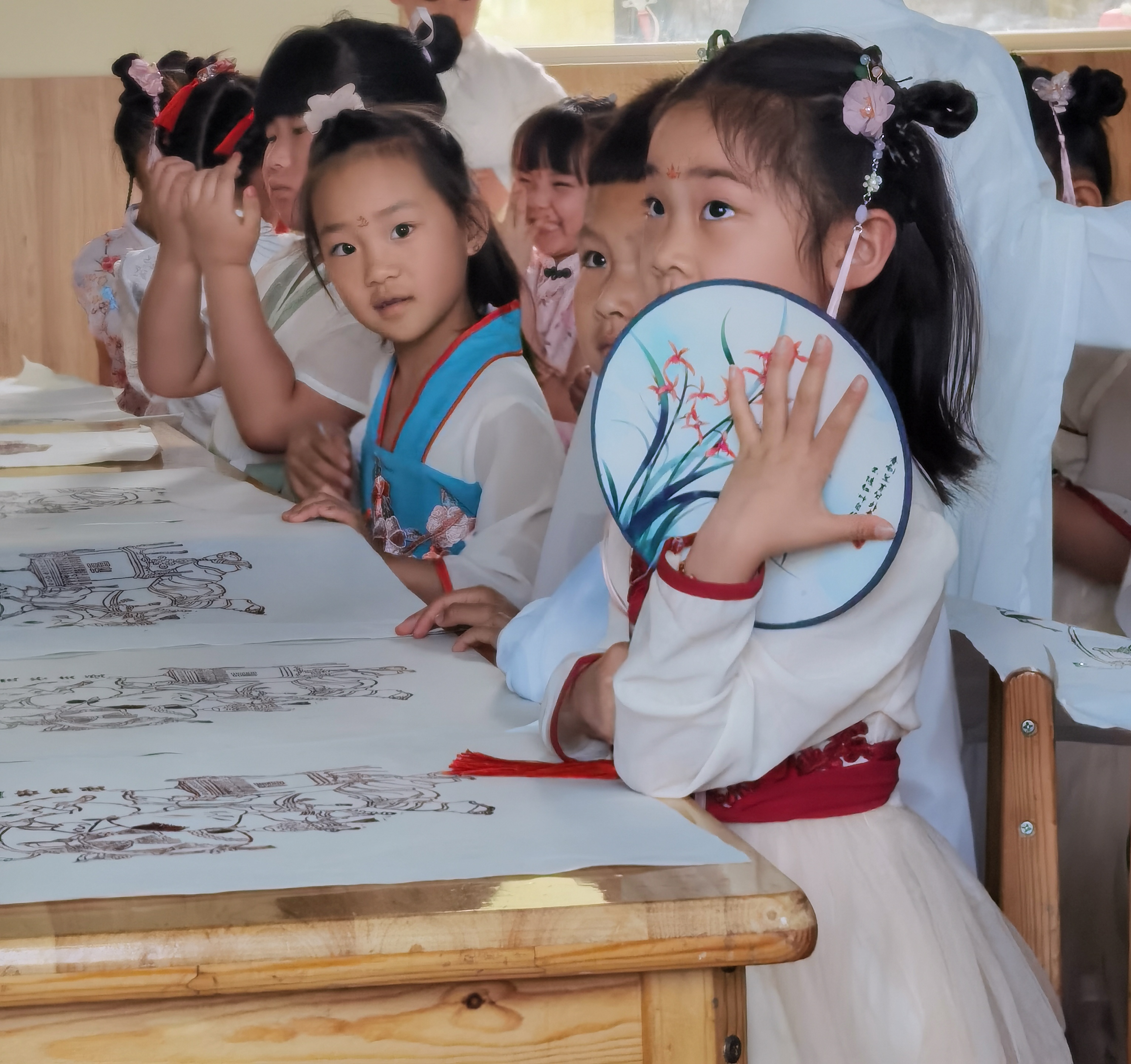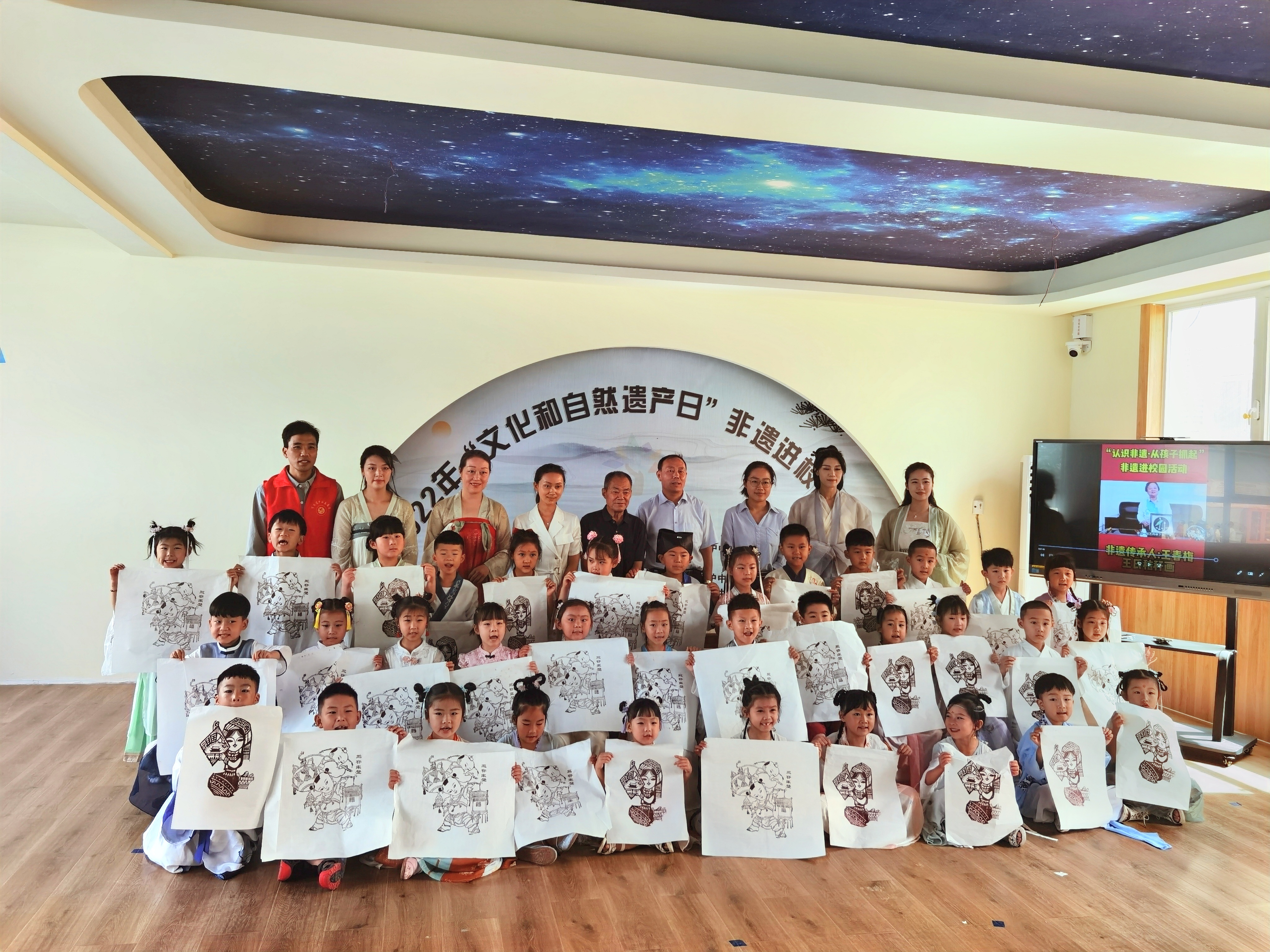 夏明月向师生们介绍周家口木版年画的历史与概况,讲解了年画的分类、特点、派系。夏明月以自己刻制的木版为例,为小朋友们展示木版年画这项古老手工技艺,并让小朋友们亲自体验印制版画的制作流程。欢声笑语间,一幅幅憨态可掬的年画作品跃然纸上,小朋友们拿着自己印制的年画拍照留念,收到了属于自己的儿童节传统礼物。