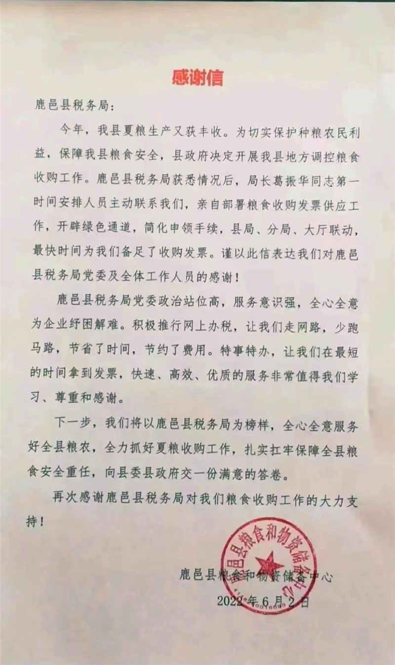 近日,鹿邑县税务局收到来自鹿邑县粮食和物资储备中心的一封感谢信,信中称:“鹿邑县税务局政治站位高、服务意识强、全心全意为企业纾困解难,助力夏粮收购工作,用最快的时间为我们备足了收购发票,快速、高效、优质的服务非常值得我们学习、尊重和感谢,谨以此信表达对鹿邑县税务局党委及全体工作人员的感谢!”